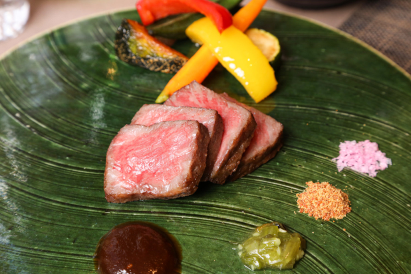 ▲宮崎牛の炭火焼き🐄春にぴったりなピンクはうめ酢と八重桜の花びらを合わせたお塩です🌸