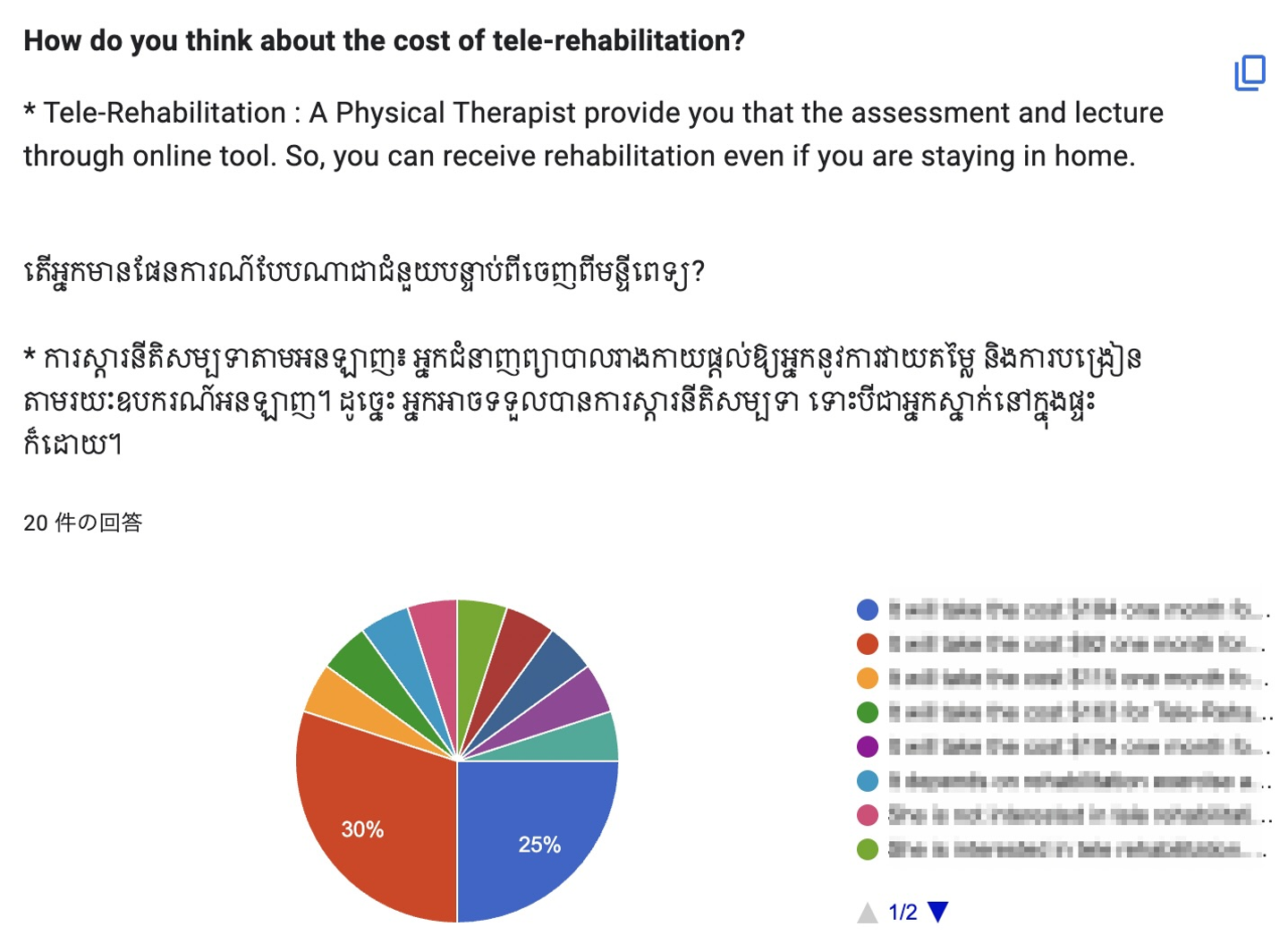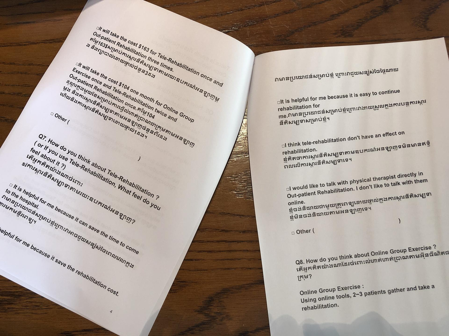 考えるだけでは分からず、また価格の変更を現地のスタッフと議論するためにも客観的な一次データが必要というアドバイスをいただき、いくつかの質問項目を決め、外来リハビリに通院していただいている患者さんやその家族に待合室でインタビューを行いました。