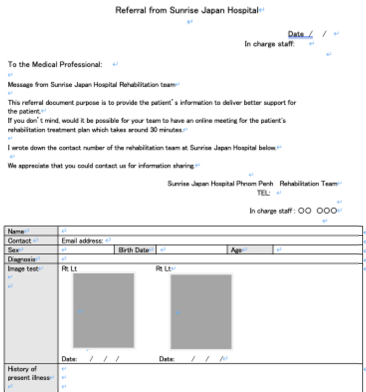 その後日本で使用されている紹介状を英訳し、実際の現場で記入の負担が増えすぎないよう内容の調整を行い、カンボジア版紹介状の作成を行いました。