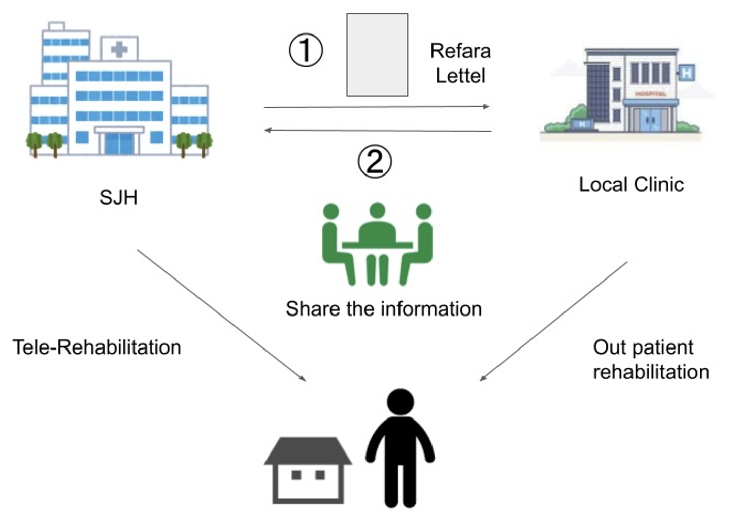 遠方に住む患者さんが退院する際にリハビリ科から地域の病院宛に書いた紹介状を書いてお渡しすることで、退院後のリハビリを患者さんが通える範囲に位置する地域の病院とサンライズ病院のリハビリ科が連携して、遠隔リハを提供するというアイデアが生まれました。