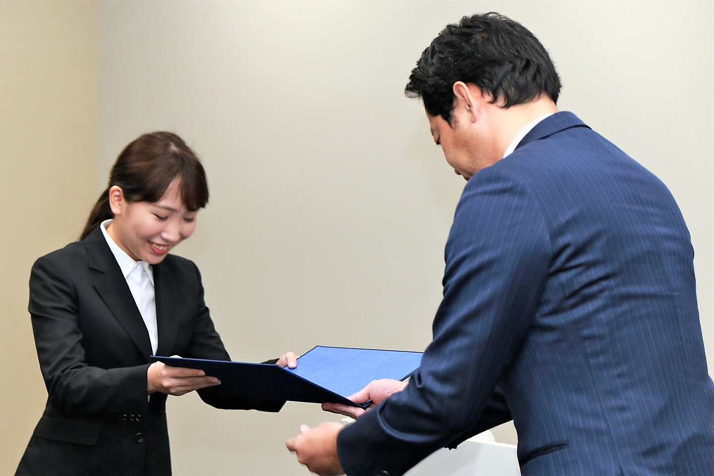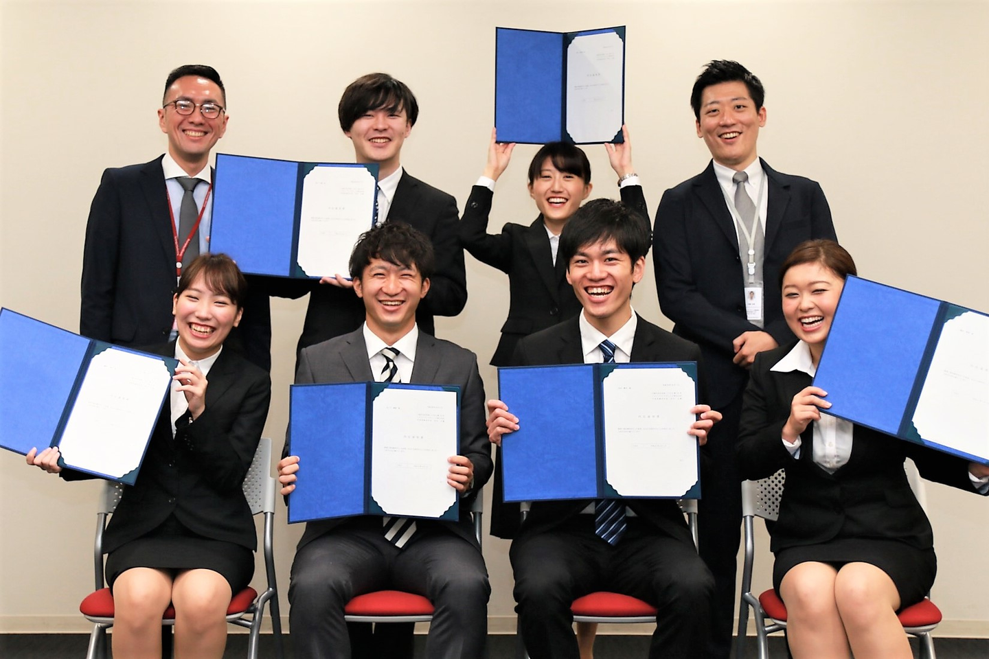 東京・大阪の内定者全員が顔を合わせるのは、今日が初めてなので、皆さん、これまでの研修の時とは違った、緊張の面持ちです。まずは、内定証書授与から。