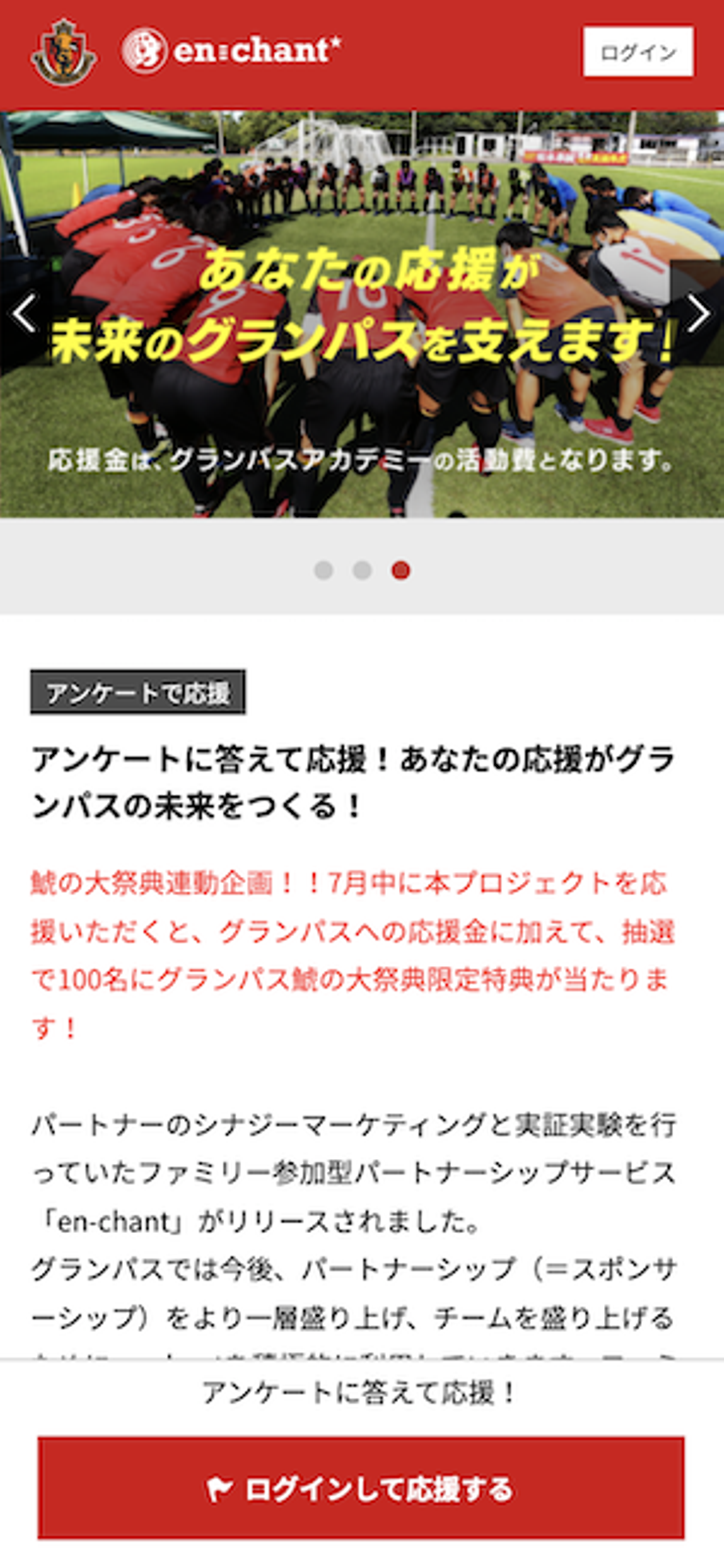 en-chantは、スポンサー企業の商品を購入したりサービスを使うなど応援アクションをすることで、スポーツチームを支援できるファン参加型スポンサーシップサービス です。