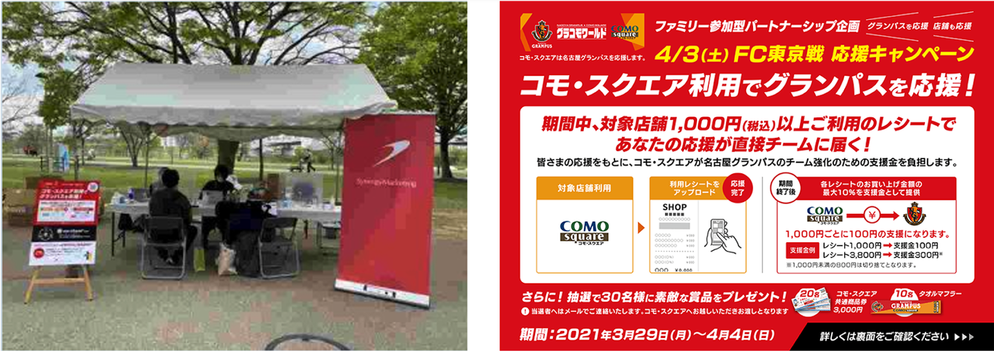 (左)スタジアムでテントを設営してユーザーインタビューを実施、(右)スタジアムで配ったチラシ