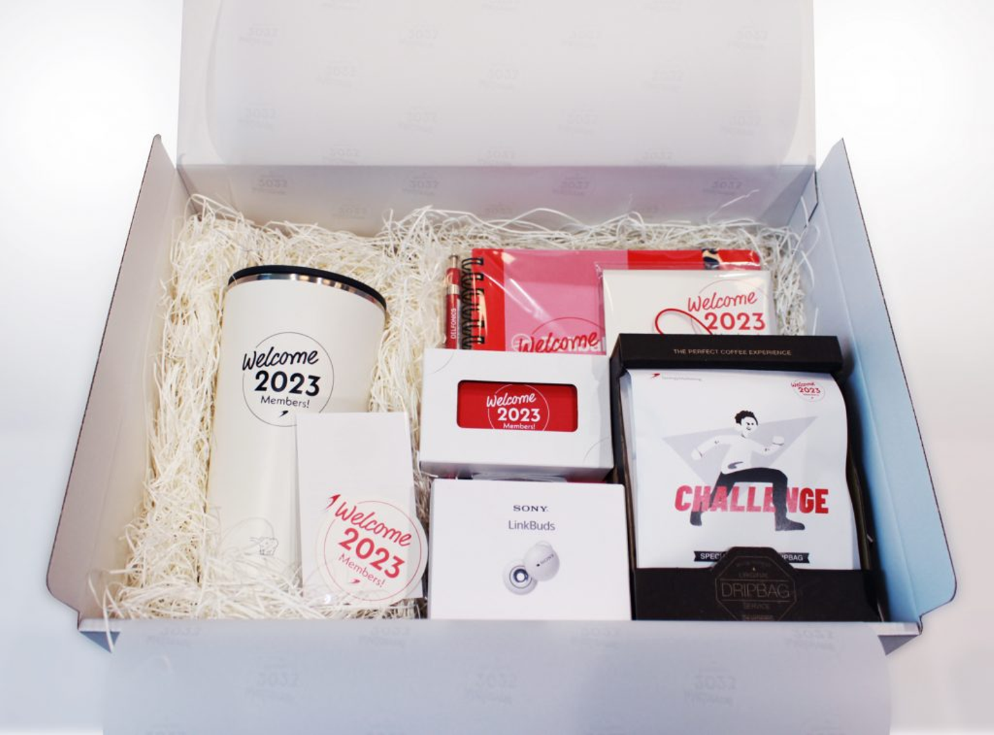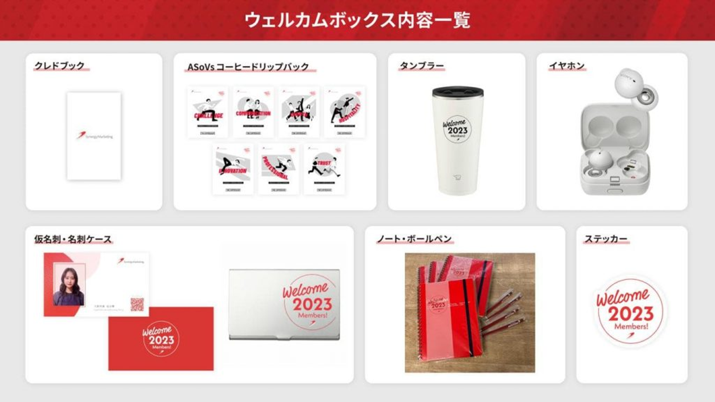 このWelcomeBoxはクリエイティブチームを中心に実用的な商品の選定や2023年度入社用の特別デザインなどイチから制作を行いました。