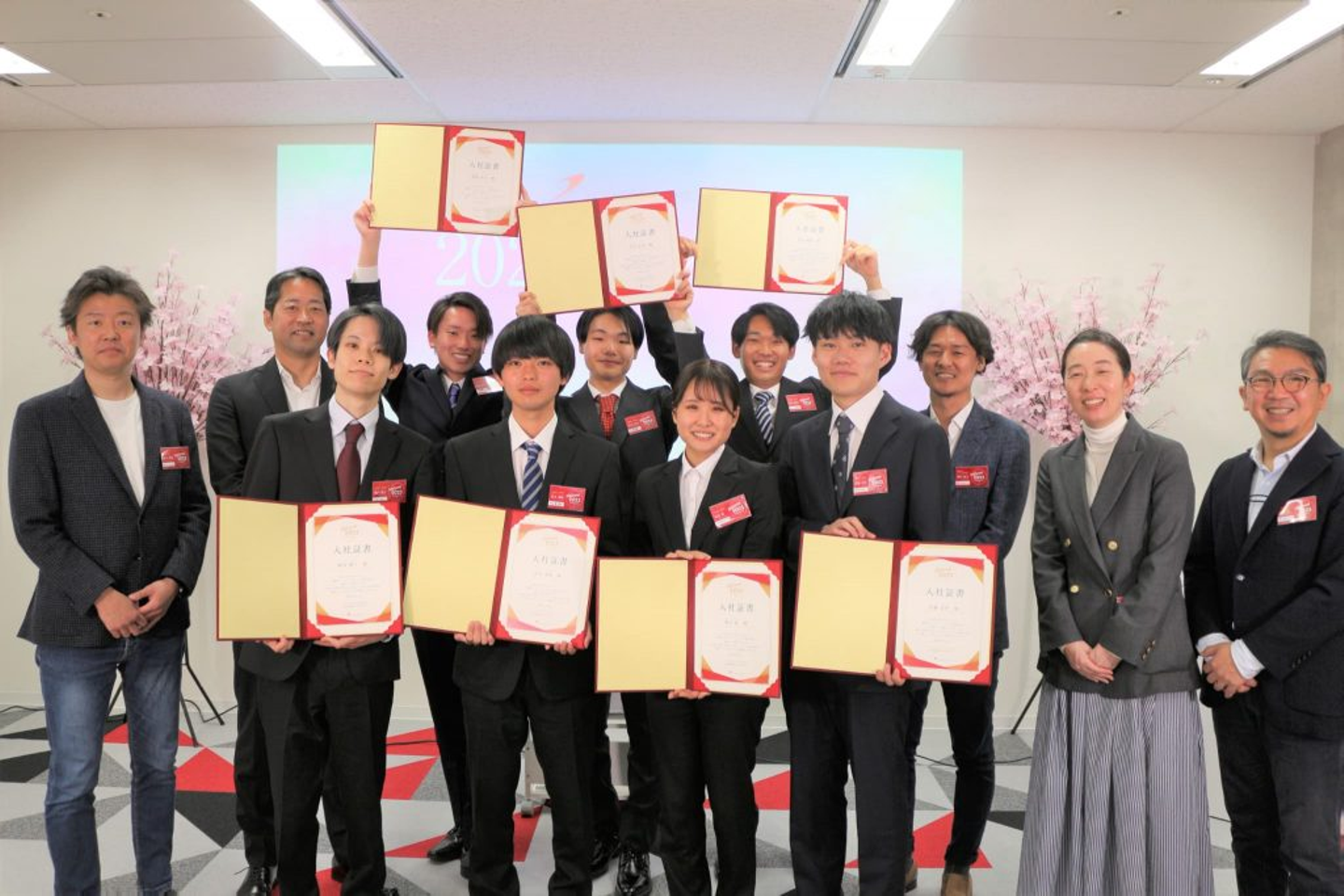 新入社員と役員、人事部門、また出社している社員も参加し、新入社員の門出を祝いました。緊張感はありながらも笑顔が多く、当社らしい和やかな雰囲気で進行し、全社員が式を見れるようリアルタイムで中継しました!