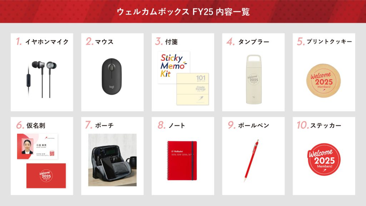 このWelcomeBoxは、プロダクトデザイン部クリエイティブデザインG所属のデザイナーを中心に、デザインの制作から詰め合わせる品の選定まで、すべて当社で行っています。