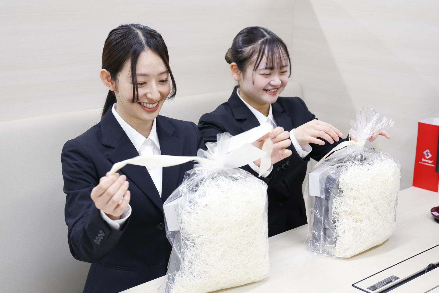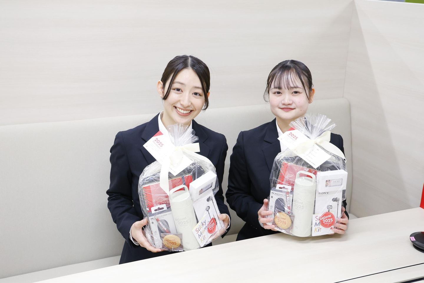 新入社員の皆さんは当社からのサプライズに驚きながら、ワクワクした表情でそれぞれの商品を手に取っていました。