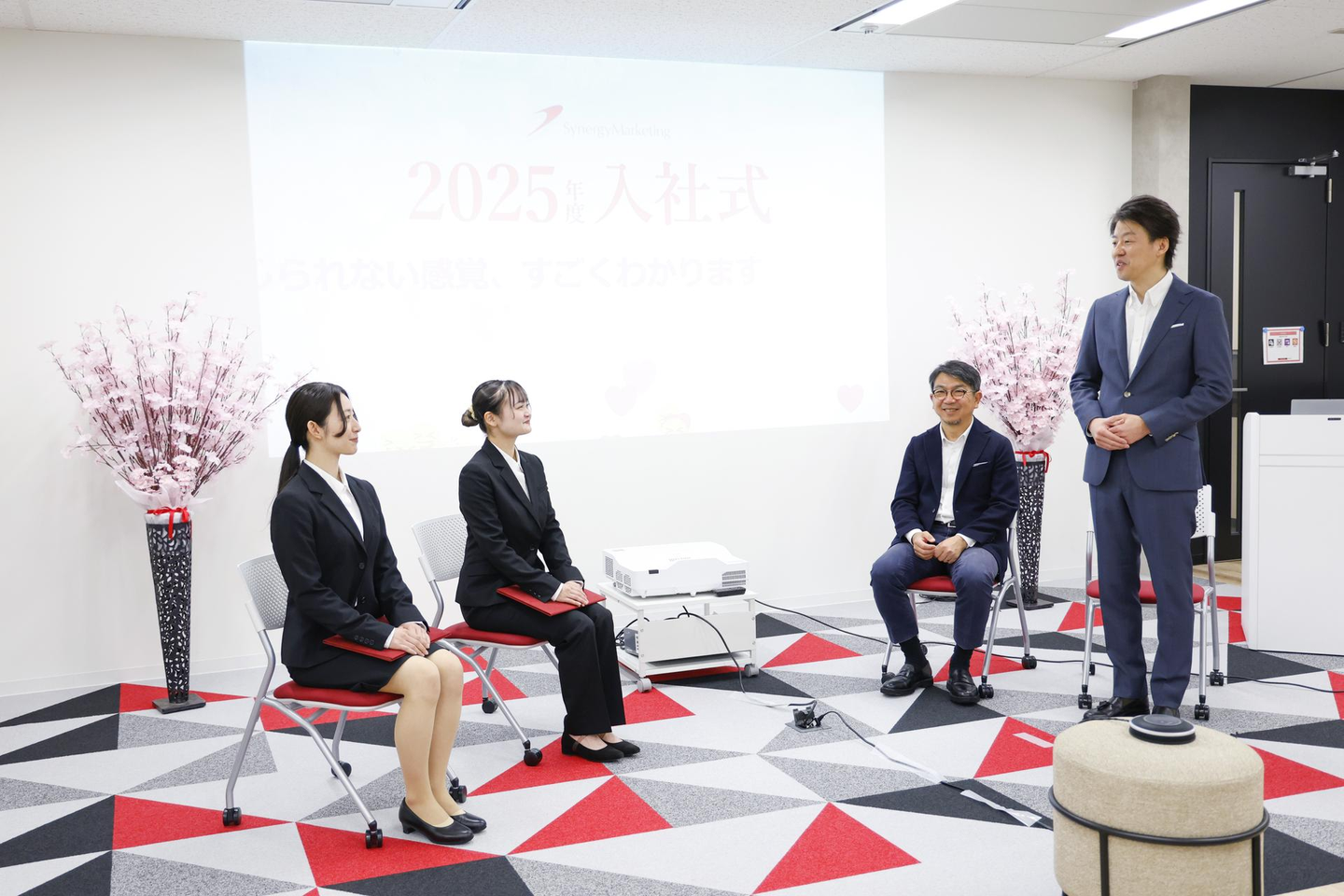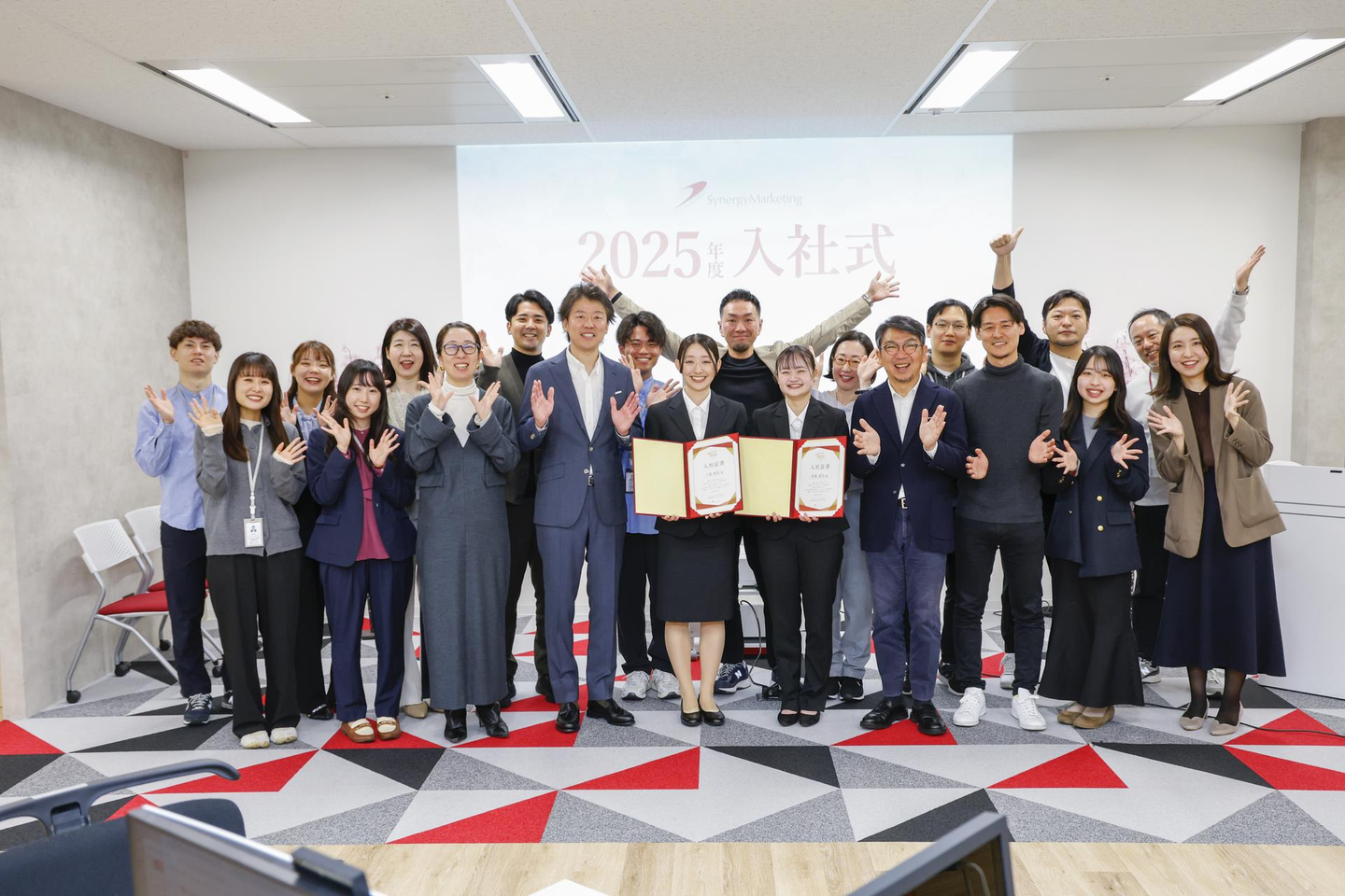 シナジーマーケティングは本日4月1日、2025年度新卒社員の入社式を大阪オフィス(堂島アバンザ)にて行いました。