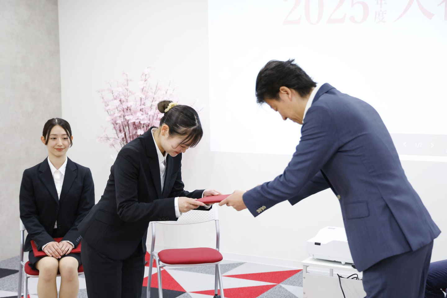 新卒入社で、本日より2年目となる内井の堂々とした進行で、入社式がスタート。 初めに、社長の奥平より、新入社員に入社証書の授与が行われました。緊張の面持ちながらもしっかりと両手で証書を受けとり、まぶしい笑顔を浮かべていました。