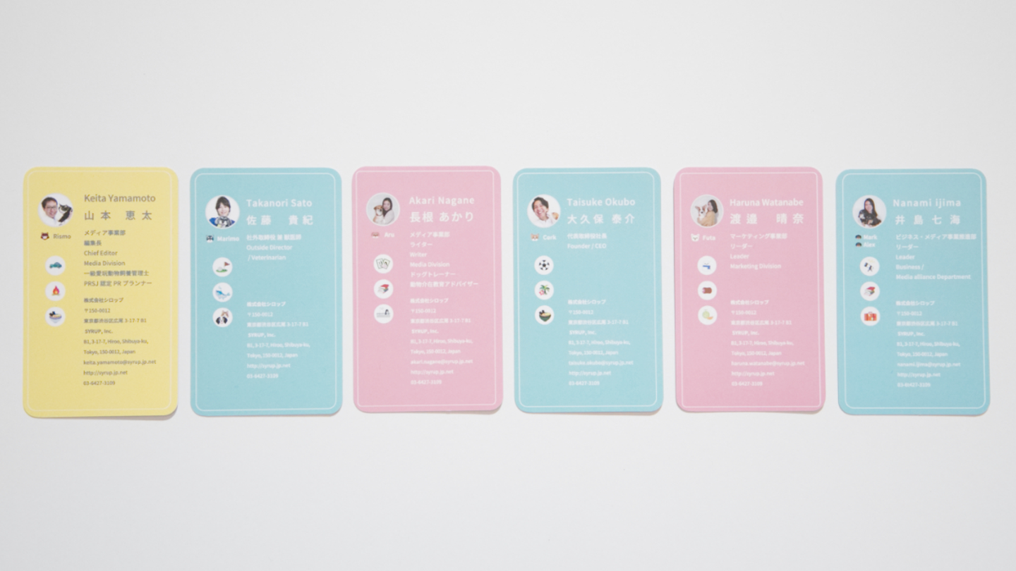 次に「サービスの顔を覚えてもらえること」ですが、裏面は弊社のミッション・ビジョンと会社のサービスを記載しています。弊社は会社名とサービス名が違うため、名刺を見てサービスを思い出してもらえるようにしました。また、名刺はペトこととOMUSUBIのメインカラーである3色にし、各社員が好きな色を選べるようにしました。