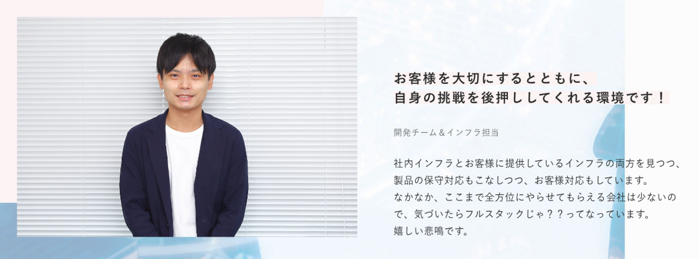 現在では、社内インフラとお客様に提供しているインフラの両方を見つつ、製品の保守対応までこなしてくれているフルスタックな社員もいます。