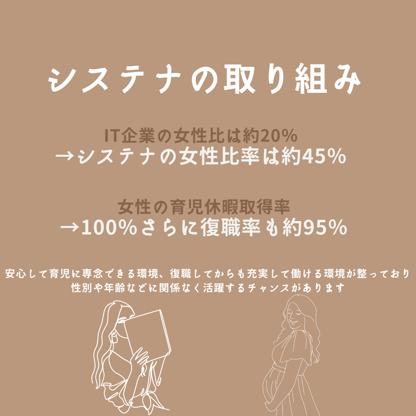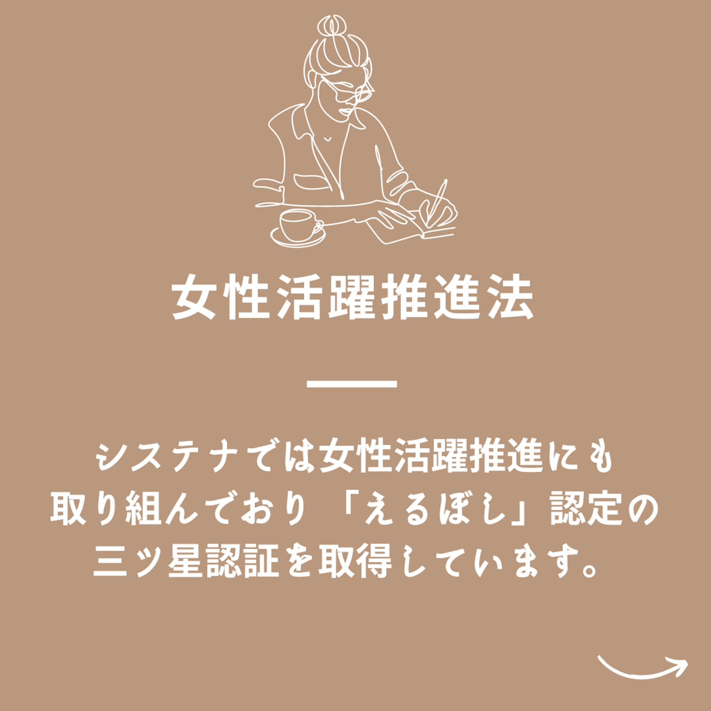 株式会社システナフォローhttps://www.systena.co.jp東京都フォローホーム私たちについてメンバーストーリー募集 女性活躍推進法の取り組みについて システナ 管理本部 広報 on 2023/08/14 システナで行っている女性活躍推進法の取り組みについてご紹介します!システナの女性活躍推進について、もっと知りたい方はこちら 女性活躍推進法の取り組みについて システナ 管理本部 株式会社システナ / 広報 システナ シェア