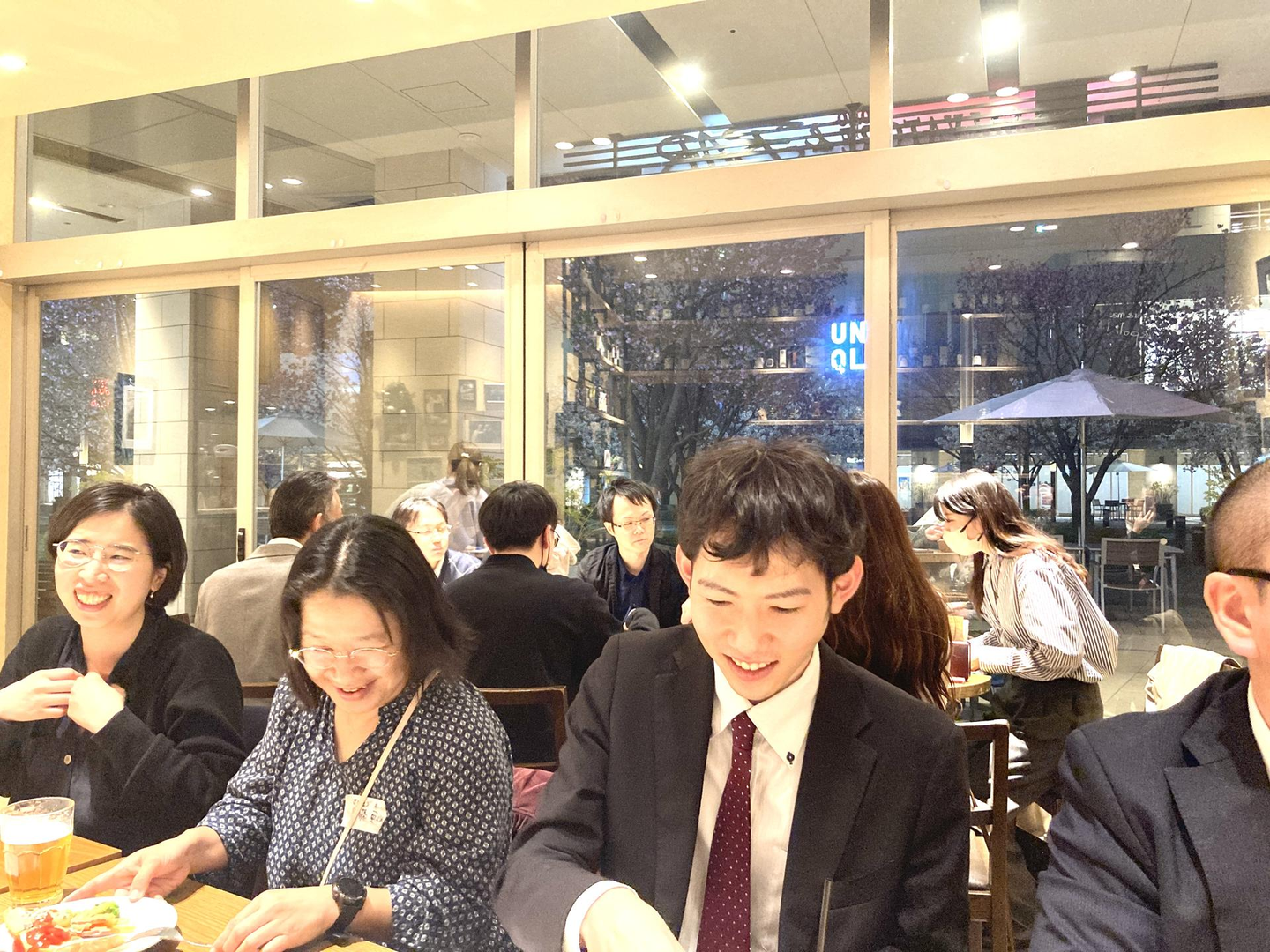 大通り沿いに面した1階のお店前には、ちょうど桜が咲いており、ガラス張りの店内から桜を眺めながら食事と会話を楽しむことができました。