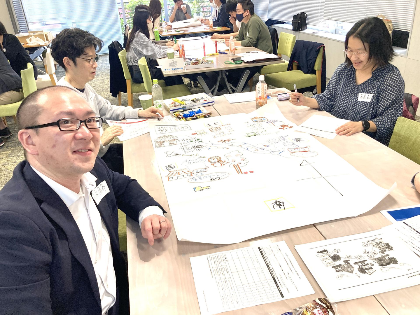 早速先ほどの効き脳診断結果を意識しながら、それぞれが持つカードの情報交換を行い、各チームで紙に絵を描いてゆきます。