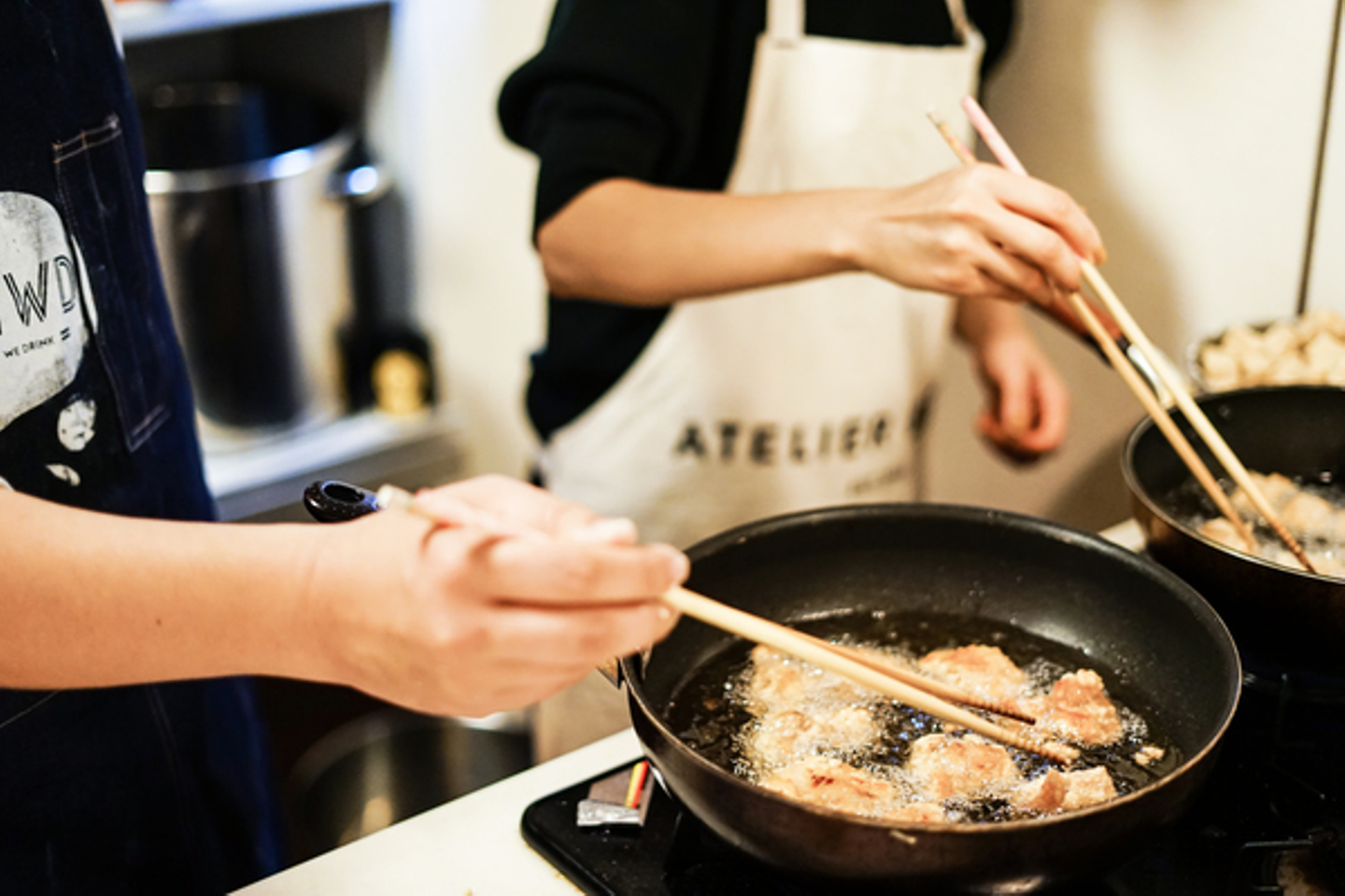 ニンニクやしょうが、ハチミツなどの下味を効かせた鶏の唐揚げをつくっていきます。男性スタッフも多いので、もも肉をチョイス。もっとヘルシーにしたいときは、ムネ肉もあり。
