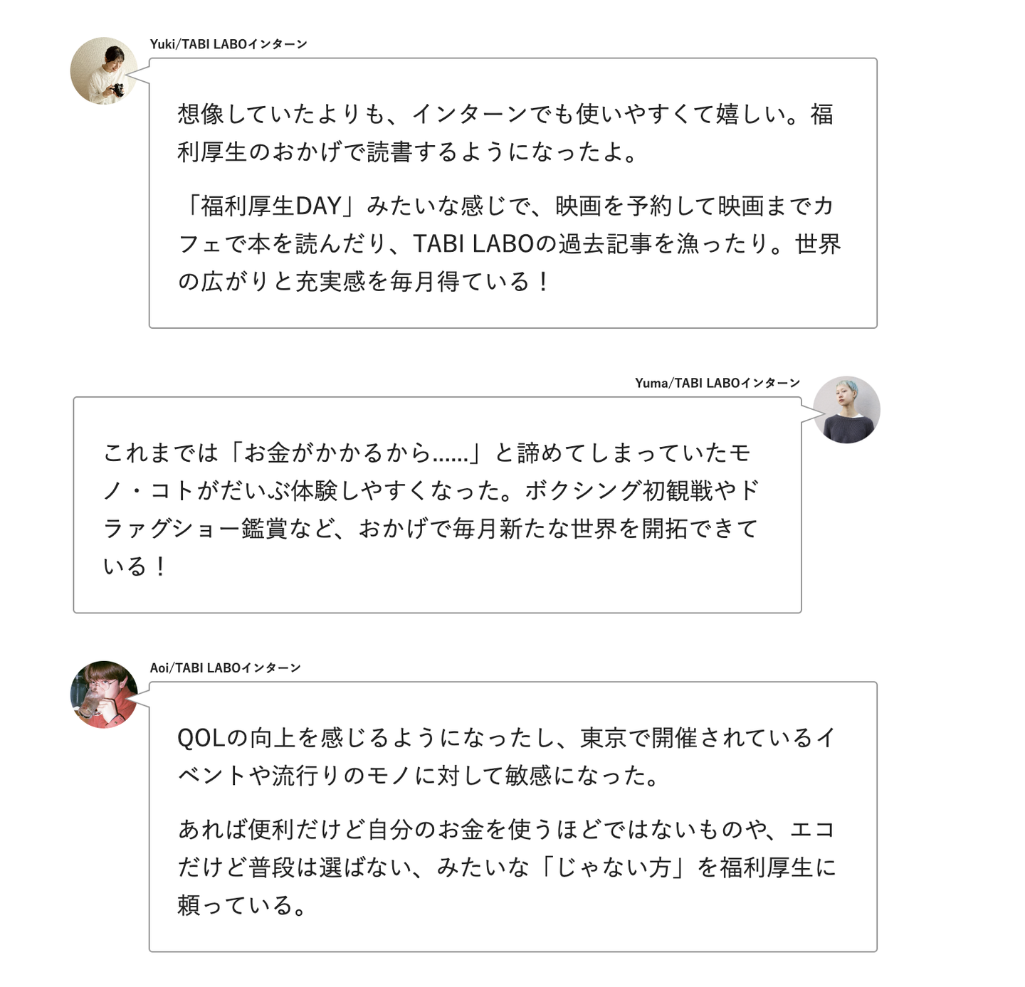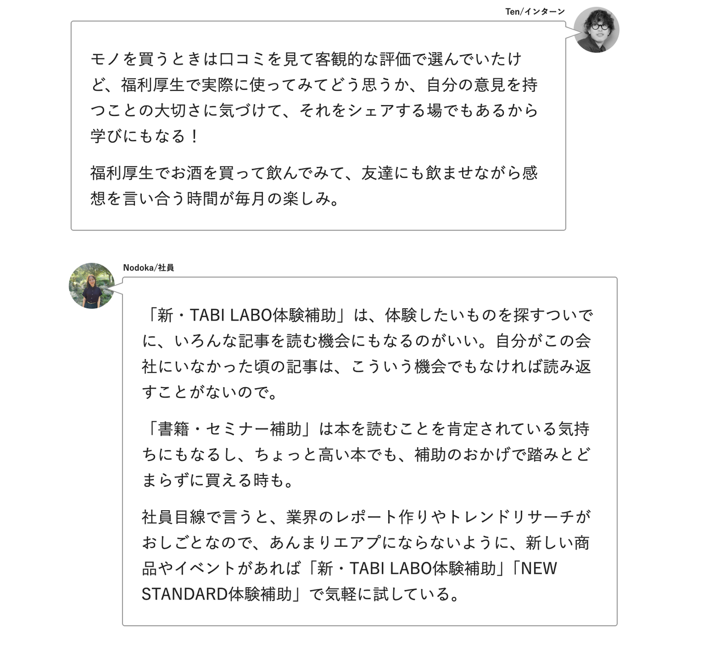 メディア「TABI LABO」にて紹介した商品を購入/体験できる「新・TABILABO体験補助」や、映画やイベントなどを体験できる「NEW STANDARD体験補助」、「書籍・セミナー補助」さらには「サウナ補助」と、あらゆる福利厚生が毎月メンバーの世界を広げる一助となってくれています。