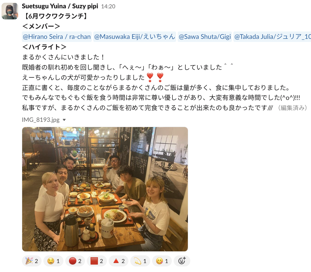 また、「わくわくランチ」は普段交流の薄い他チームのメンバー同士がランダムで選ばれる設計。Slackで写真も共有するので、おいしい料理とともにランチタイムのほっこり顔が見られるのもGood♪ こちらも大人気の福利厚生です。