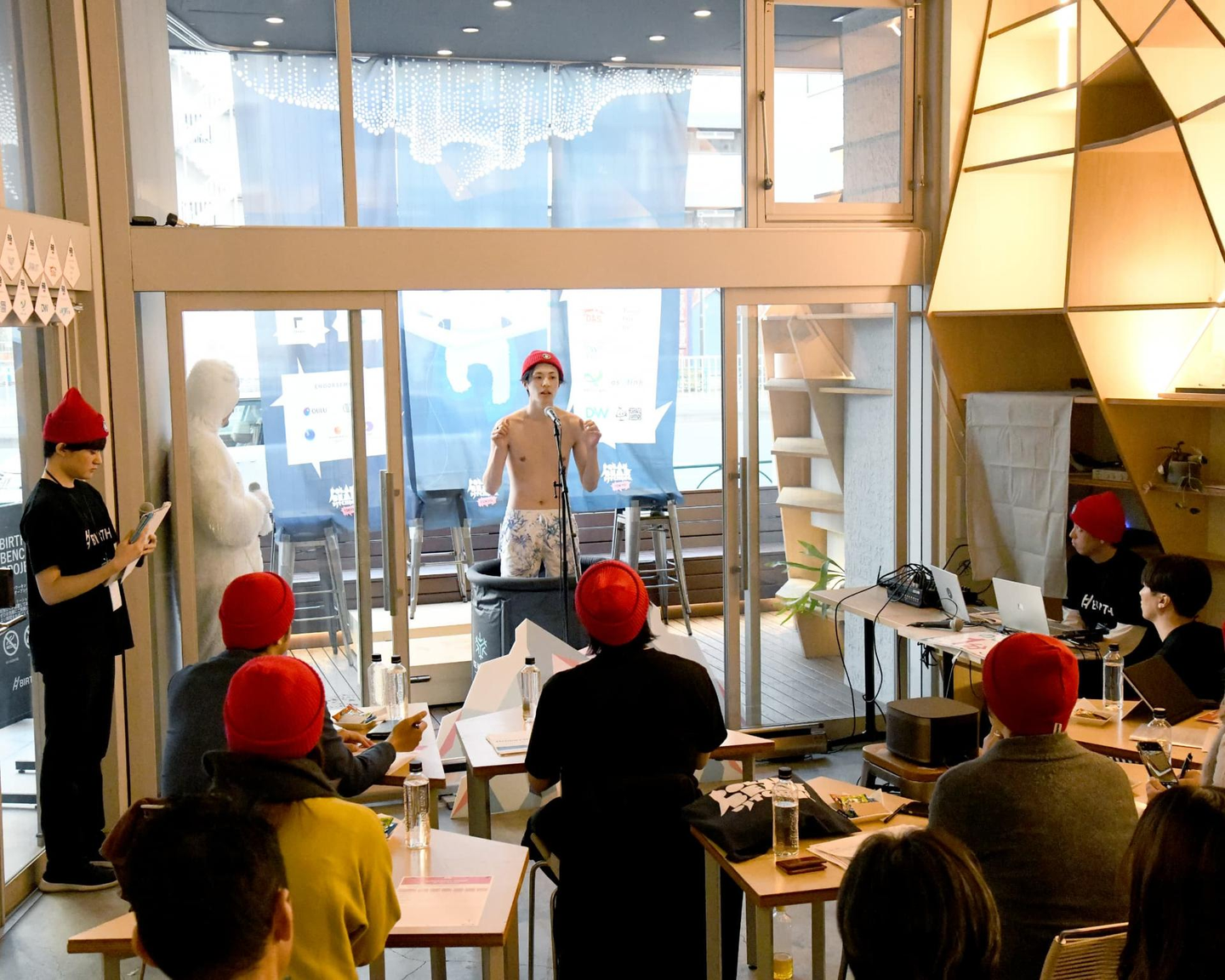 冷たさが骨身に染みる氷水に入った瞬間、参加者たちは覚悟を決めた表情を浮かべ、自らのビジネスに対する想いを全力で語り始めます。観客たちは、その姿に釘付け。体は震えながらも、挑戦者たちの声は力強く、胸を打つ言葉が英語で次々と飛び出していました・・!