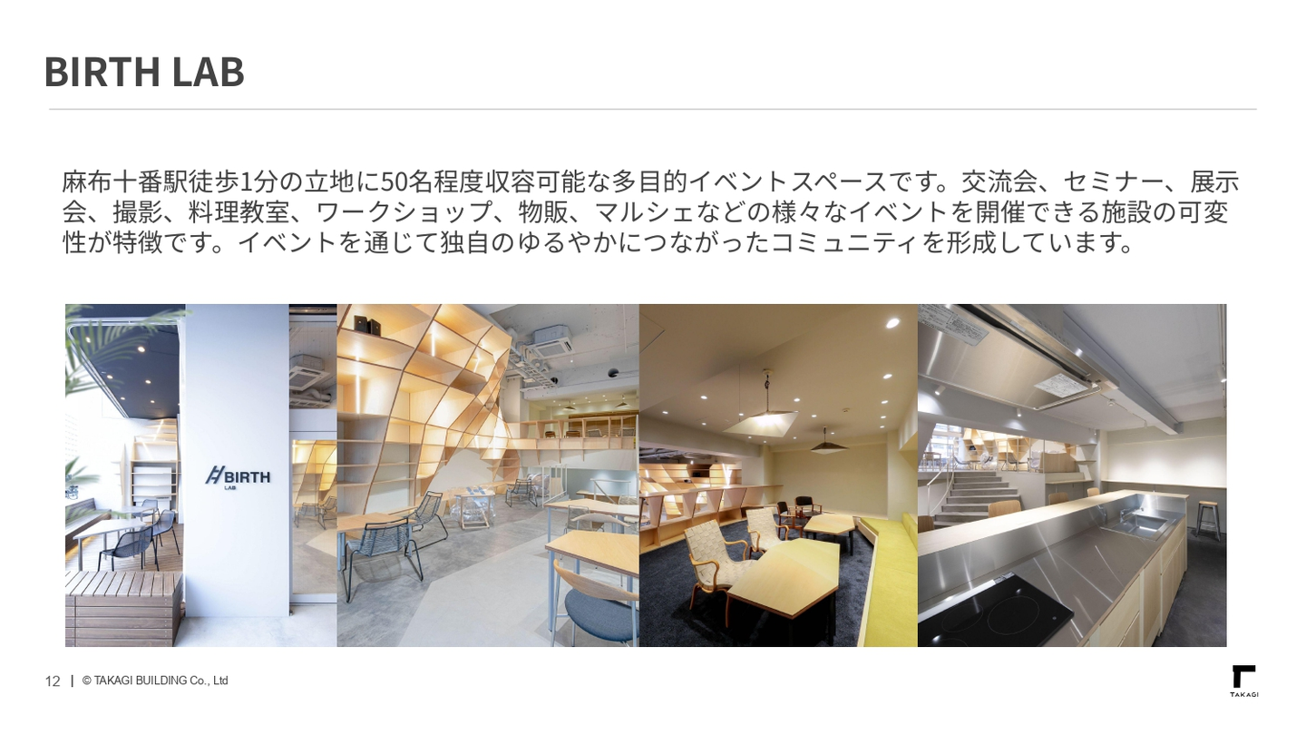 麻布十番駅から徒歩1分に位置するBIRTH LABは、キッチン・ラウンジ・イベントスペースを備えた多目的施設。地域の方々や利用者が自由に集い、自然とコミュニティが生まれています。地域自治体や企業のイベントにも活用され、地域活性化の拠点となっています!