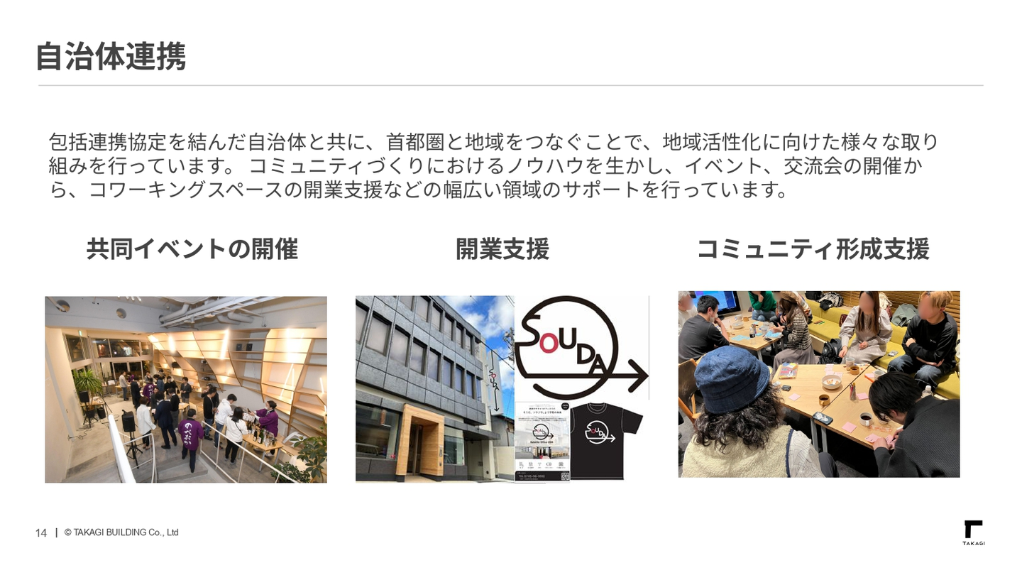 髙木ビルでは一般的な不動産会社のように、短期的な利益の獲得を目指して、売買や仲介をするといったことは、ほとんどしていません。不動産を単なる「ハード」や「箱」としてではなく、「ソフト」や「人の集まる空間」であるという視点を大切にしながら、不動産に様々な要素を掛け合わせ、新しい価値を生み出す事業を展開しています。