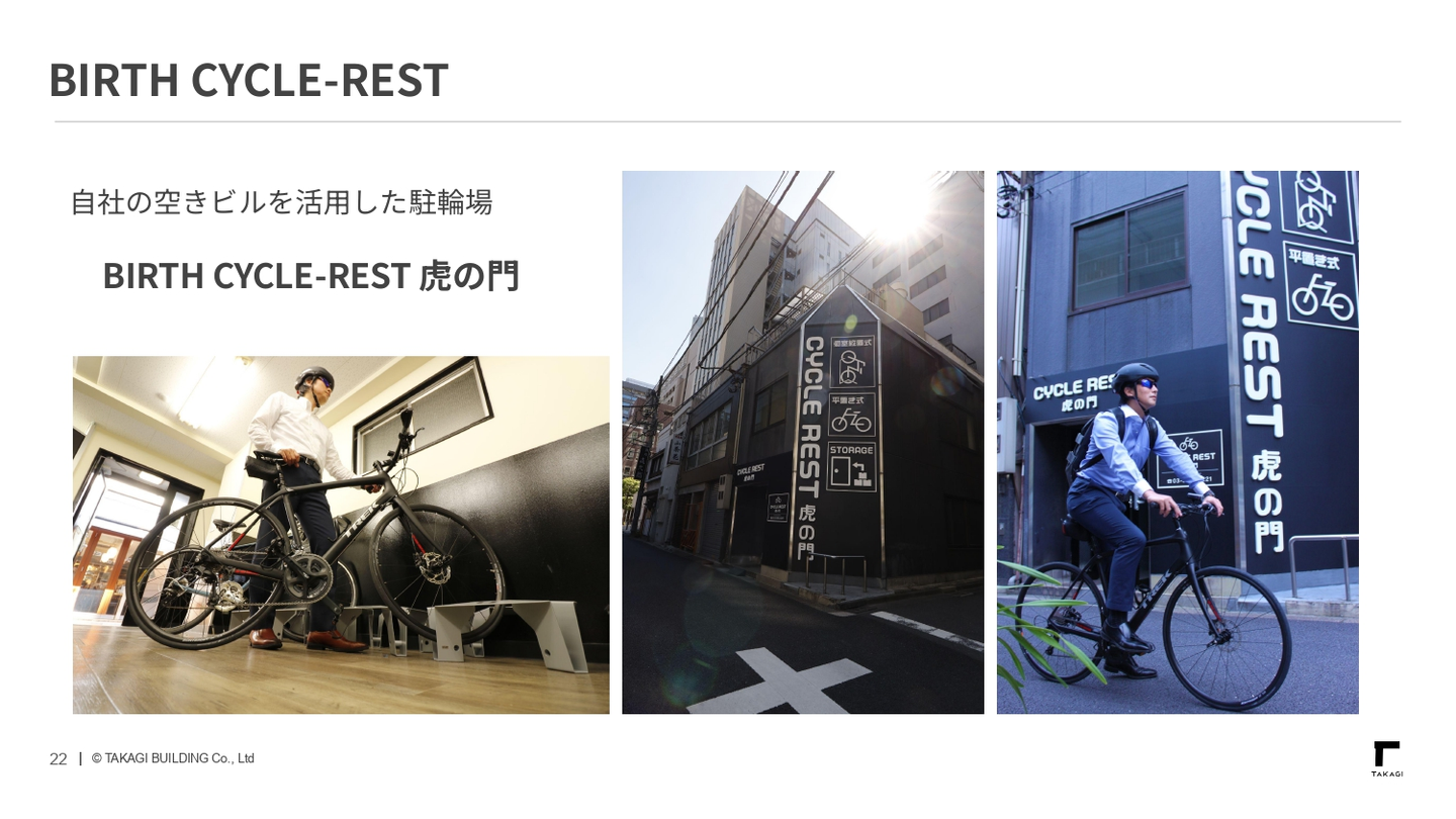 活用の難しい小規模物件での新たな取り組みの1つです。虎ノ門エリアの自転車通勤需要に対して、駅前や周辺のサイクルステーションは利用時間が限られたり、混雑や盗難の心配がある一方で、屋内型の24時間利用可能という点が功を奏し、ウェイティングリストができるほど人気の自転車置き場として運営できています!