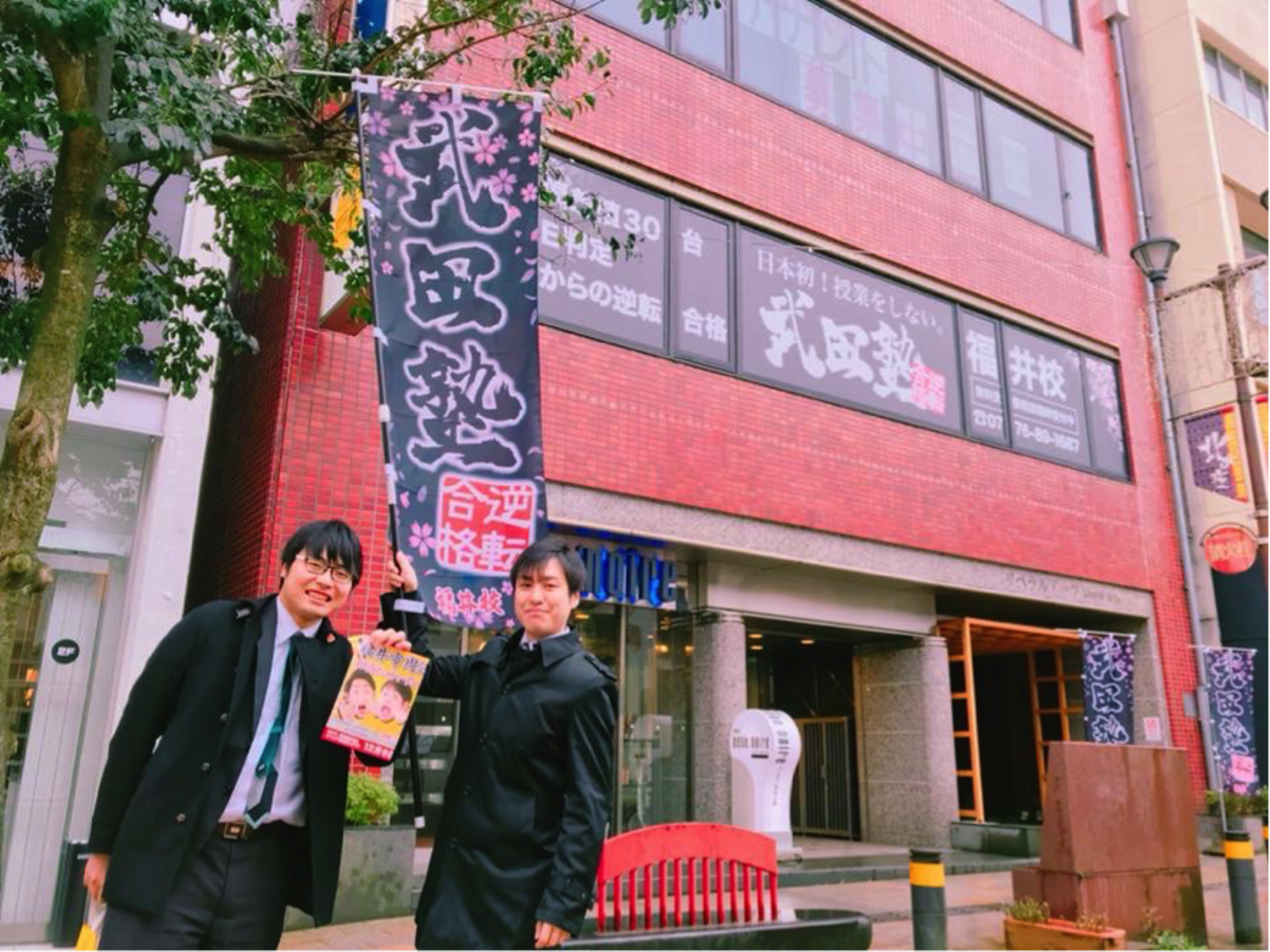 写真は武田塾福井校に行った時の写真です。左が高田です。開校初日に校舎の様子や今後についてお話しました。