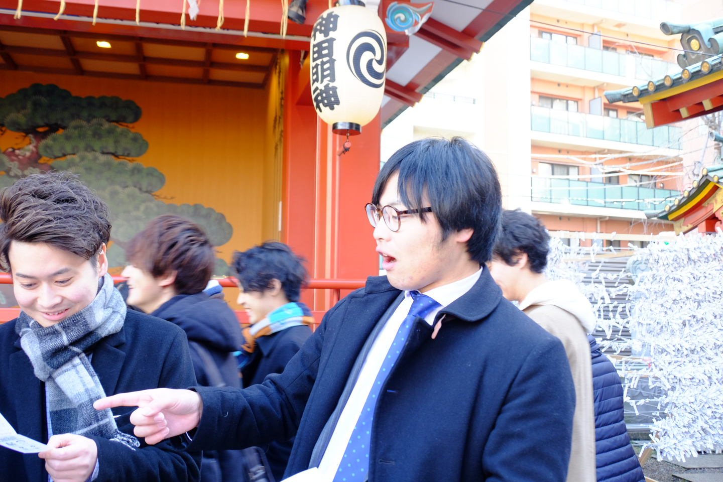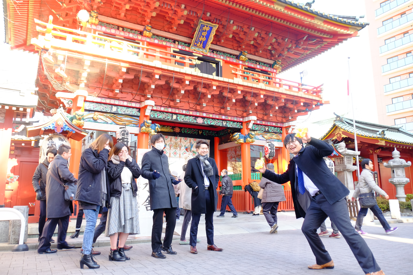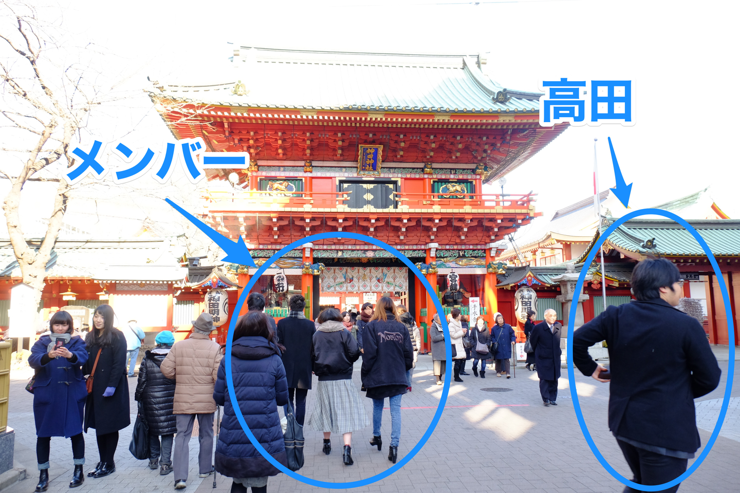 鳥居をくぐって神田明神に向かおうとすると、新入社員の高田だけ別の方向に向かっていきました。