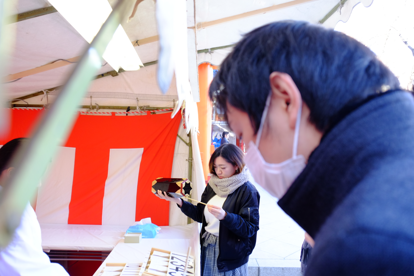 おみくじを降って、引きます。(手前は副校舎長の太田です)