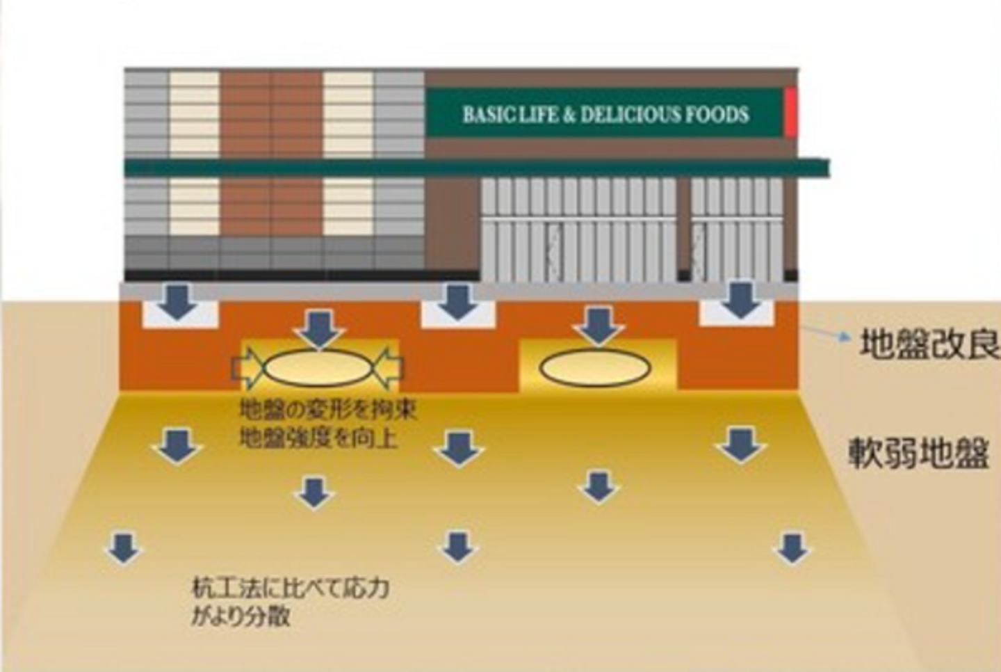 TNF工法は、日本に多い「軟弱地盤」という、従来の工法であれば長い杭を何本も打たなければならない土地であっても、地面の表面を改良するのみで施工できます。