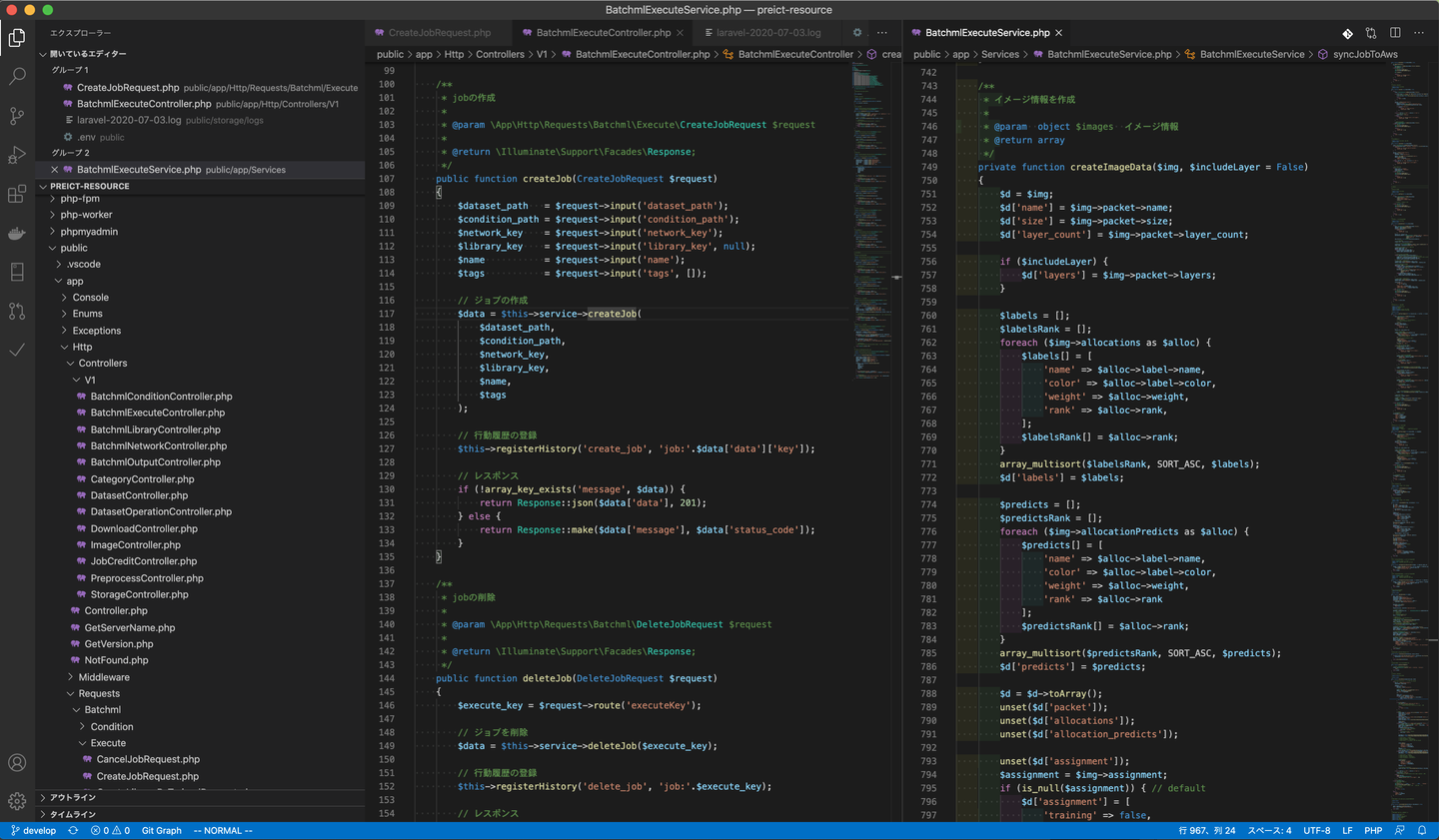 コーディング規約は大体はフレームワークに則っています。PHPであればLaravelのものを、JavaScriptであればVue.jsですが、Linter, prettierを活用してなるべくはメンバーごとの差異を無くそうとしています。コメントの言語は英語を推奨していますが、日本語でも構わない、としていて半々くらいで混在しています。