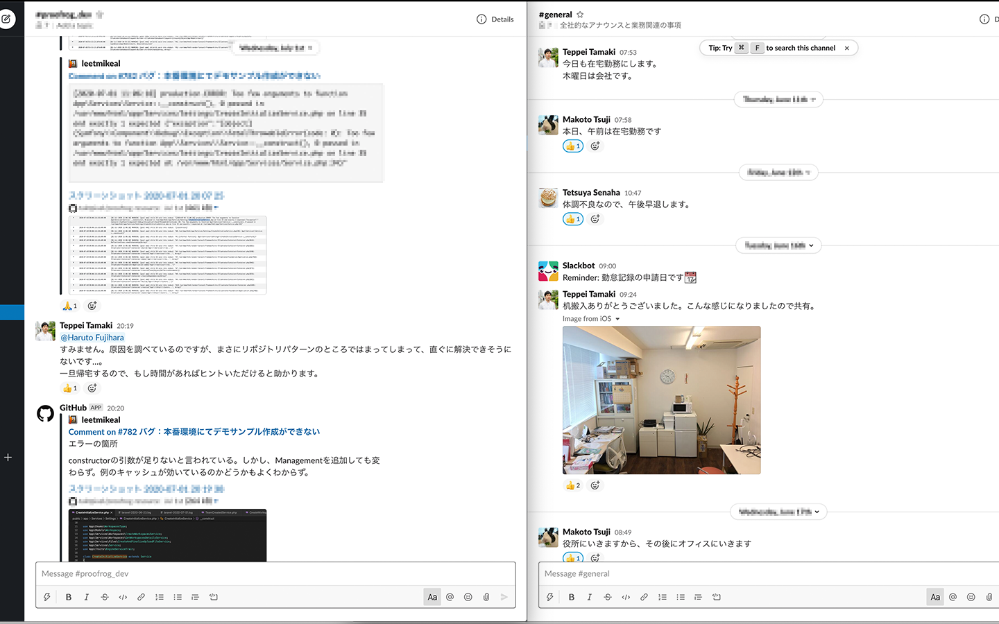 Githubの動きはSlackの開発チャンネルにも共有され、異なる話題が同じチャンネルで議論されることもあるので、チャンネルの動きは活発です。ただ、私自身も含めて真面目なメンバーも多いのでrandomチャンネルでもあまり雑談はありません。スタンプは良く使います。