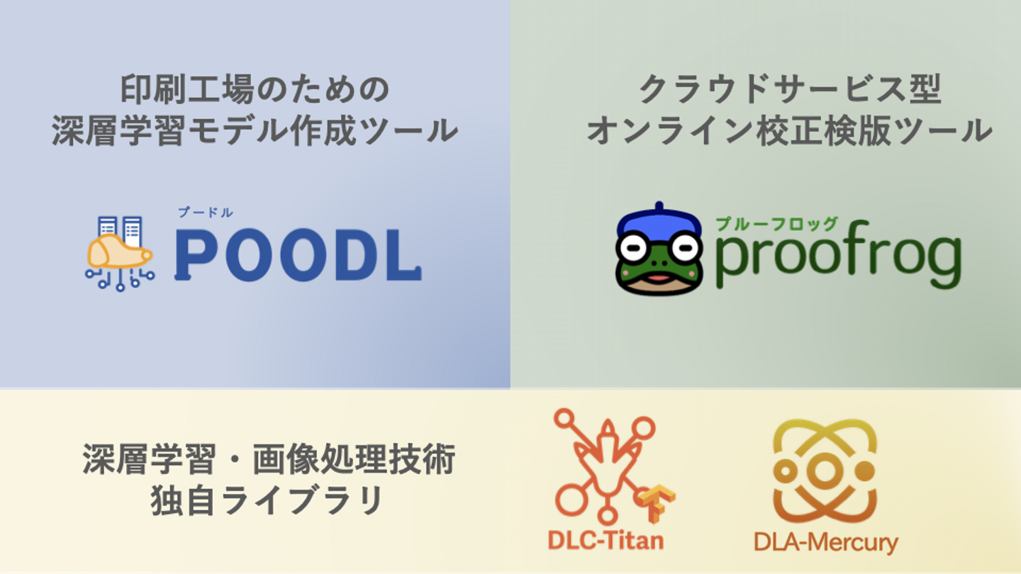 創業3年目で、製品を2つリリースしています。一つは、印刷工場のポストプレス(印刷後工程)で目視検査を省人化・省力化する「POODL(プードル)」で、もう一つはクラウドサービス型のオンライン校正検版ツール「proofrog(プルーフロッグ)」です。他にも、画像処理や深層学習技術の基盤の部分をPythonパッケージとして切り出して扱いやすい形でまとめた独自ライブラリがあります。