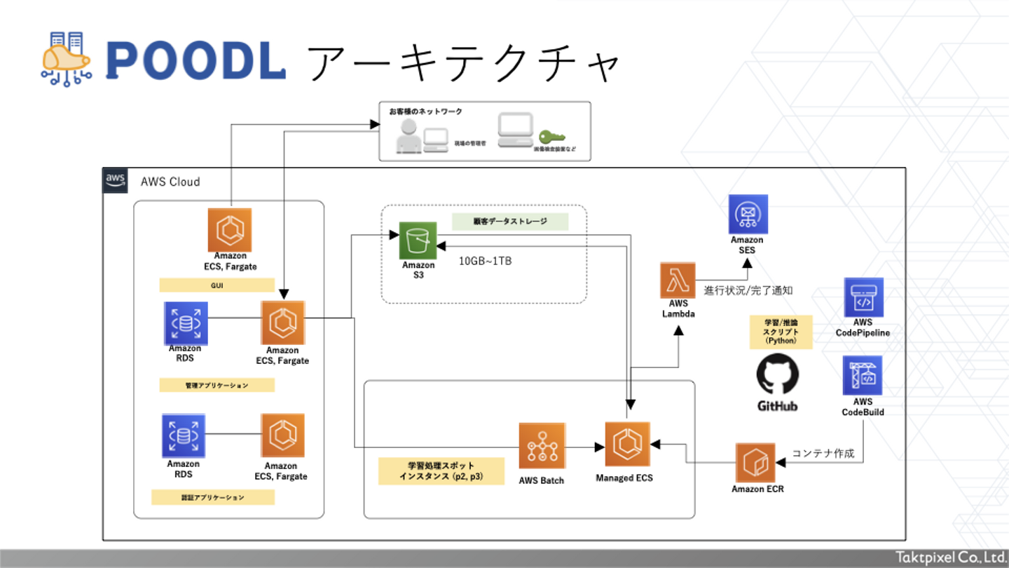 2つの製品とも、WebアプリケーションでありAmazon Web Service (AWS)上で稼働しているサービスです。POODLが深層学習のバッチ処理のためにGPUインスタンスを使うこと以外は、2つのサービスどちらも似たような環境で開発しています。