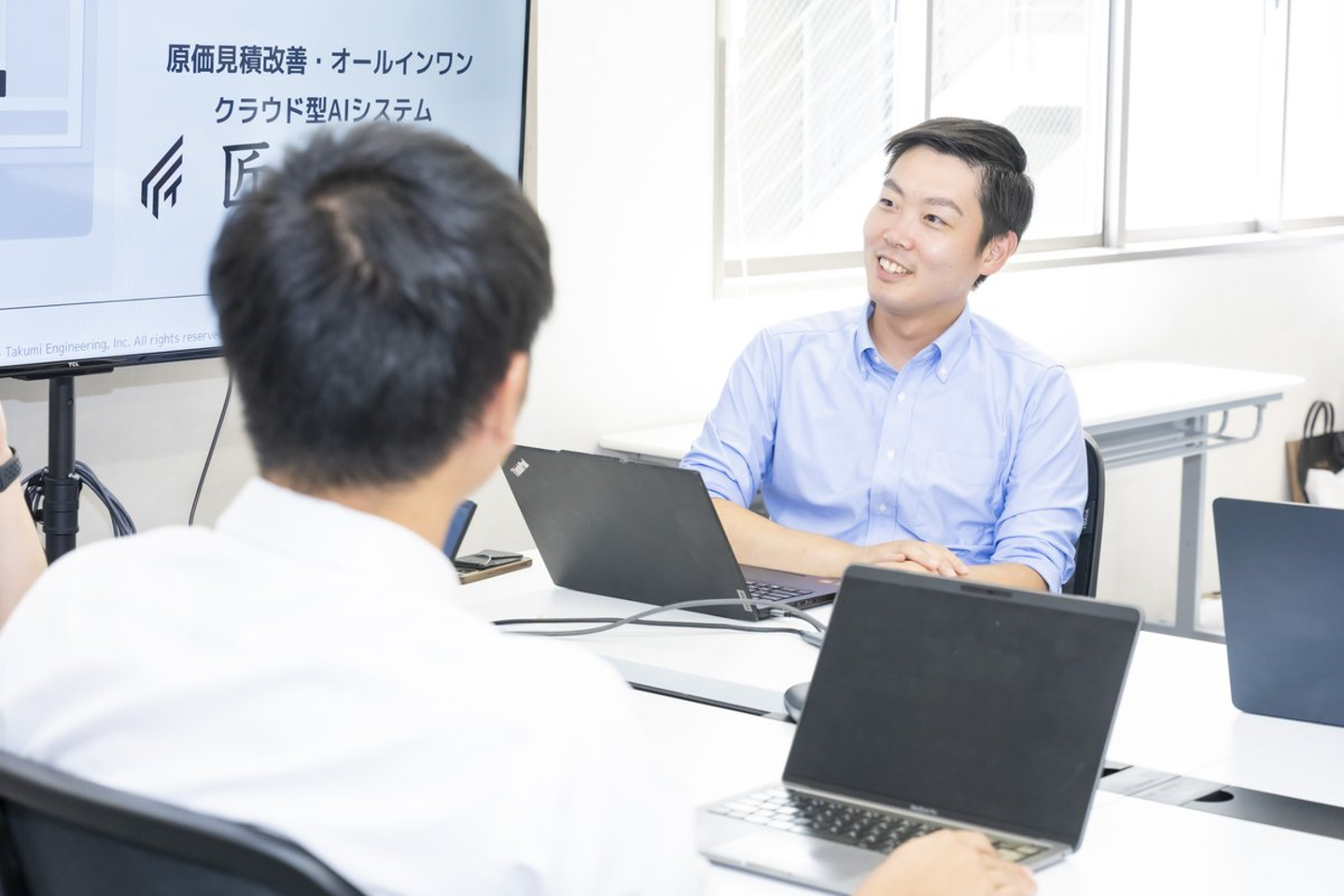 加えて、匠技研工業の魅力として感じるのが、「大企業での経験が活きやすい」ということです。社内調整や仕事の進め方については、大企業で学んだことが活きる機会が多いと感じます。SaaSといういわゆる「今風」のサービスを製造業界の方々に分かりやすく伝えるには、大企業で働いていた経験が十分活かせます。大企業からスタートアップに転職する人も増えてきてはいるものの、まだまだ絶対数としては少ないので、貴重な人材です。