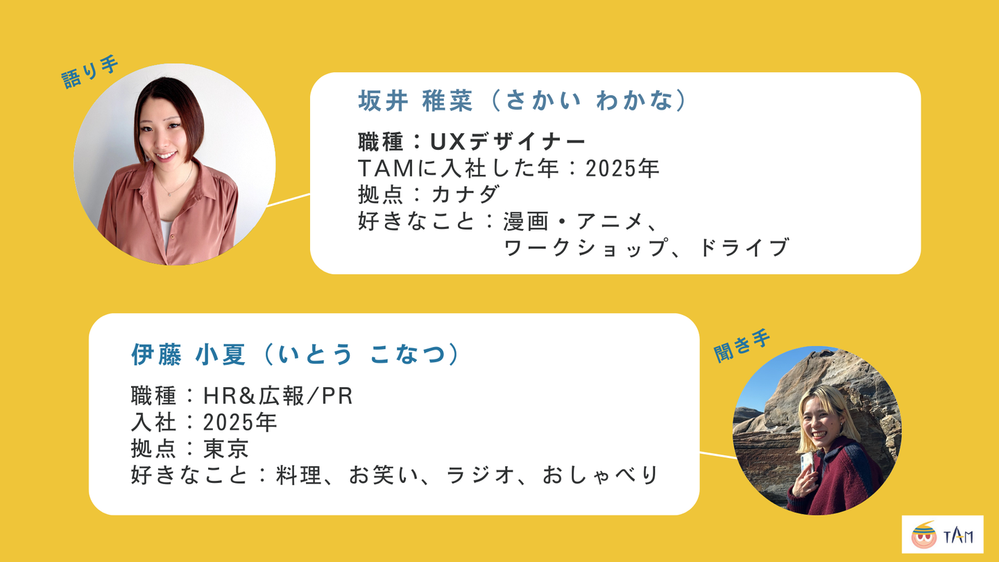 TAMメンバーにインタビューする「TAMのお仕事図鑑」シリーズ。今回はUXデザイナーとして活躍する坂井さん。現在はカナダを拠点に、日本のTAMとアメリカのスタートアップの2つの会社でダブルワークをしています。