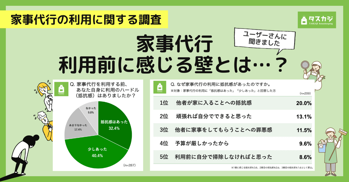 ▶︎ 家事代行タスカジ『家事代行の利用前に感じるハードルと乗り越え方』を調査 〜家事代行利用のはじめの抵抗感は70%に上り、利用きっかけの多くは「限界に達したから」と回答〜