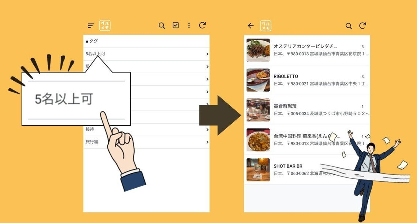 この上野さんのこだわりによって、「#5名以上可」「#徒歩7分以内」「#ラーメン部」といったタグから、直感的にお店を探し出すことが可能になったそうです!