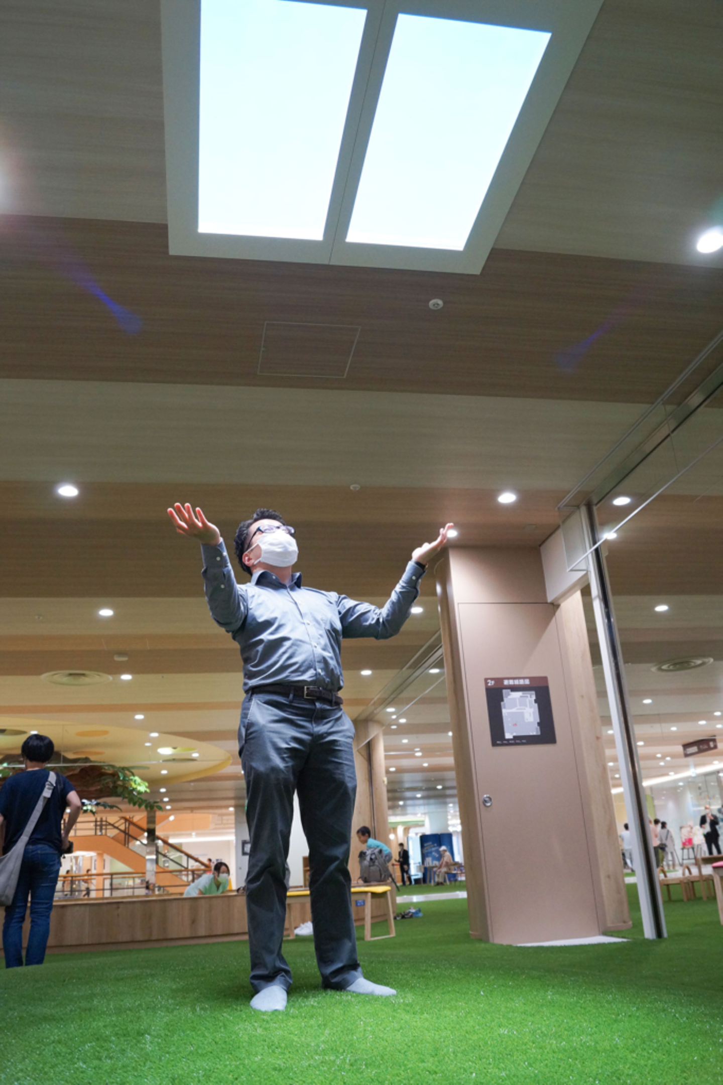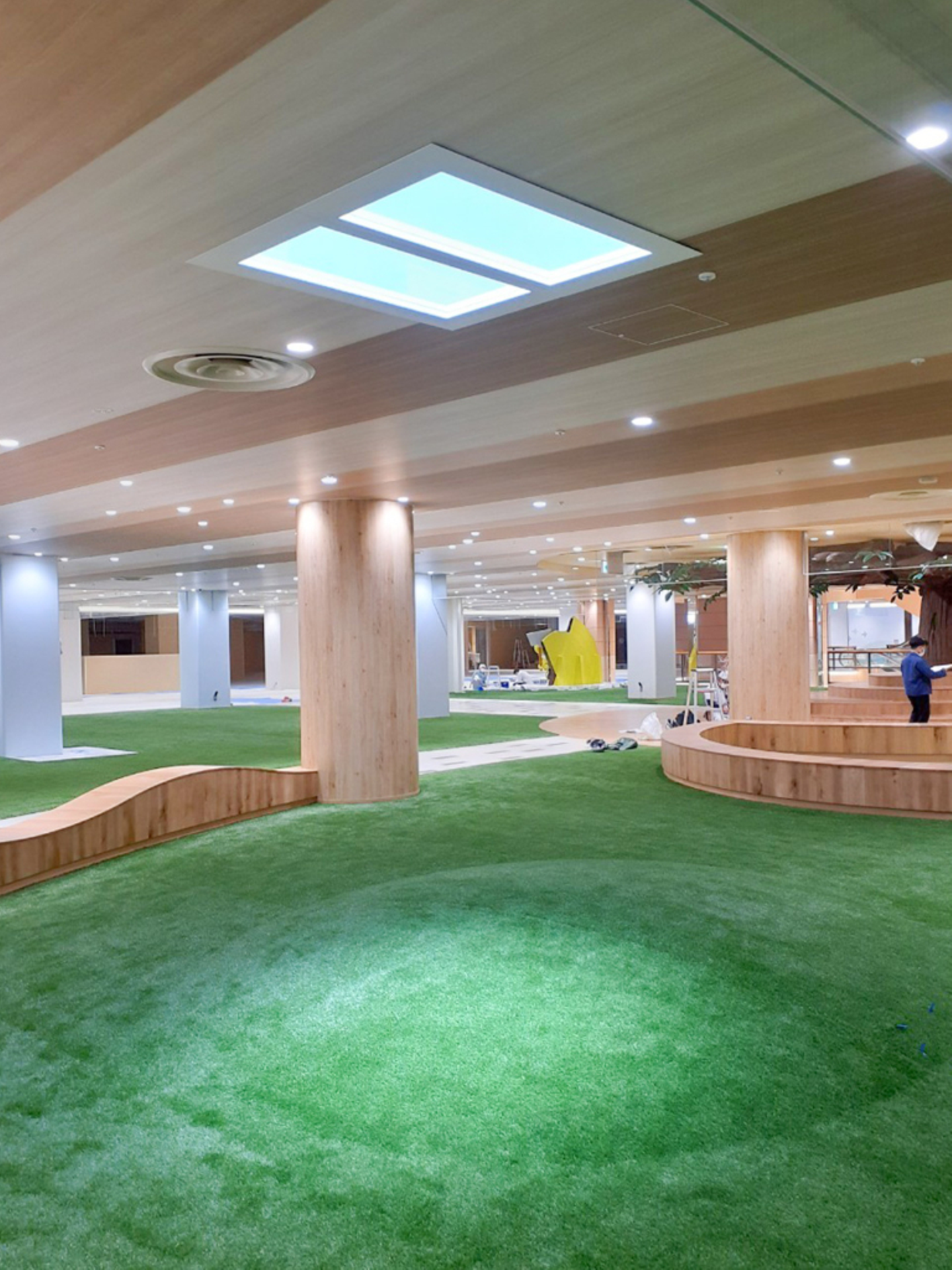 どこまでも続くような青空と、射し込む太陽の陽射しが芝生広場とあいまって、屋内にいながら自然の中でくつろいでいる感覚になります。天候の影響を受けず、子供たちもはだしで走り回れる、とてもにぎわいのある空間になりました。