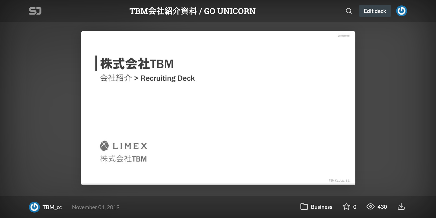 こんにちは。コーポレート・コミュニケーション本部の増田です。 TBMは、2019年11月3日に日本経済新聞で発表された「NEXTユニコーン調査」で第2位にランクイン、国内6番目のユニコーン企業として取り上げていただきました。ユニコーン企業の仲間入りをしたTBMの採用面接/面談で使用している会社説明資料を遂に公開します!