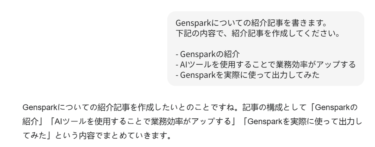 今回は、Gensparkに「Gensparkの紹介記事を書いて」とお願いしてみました。