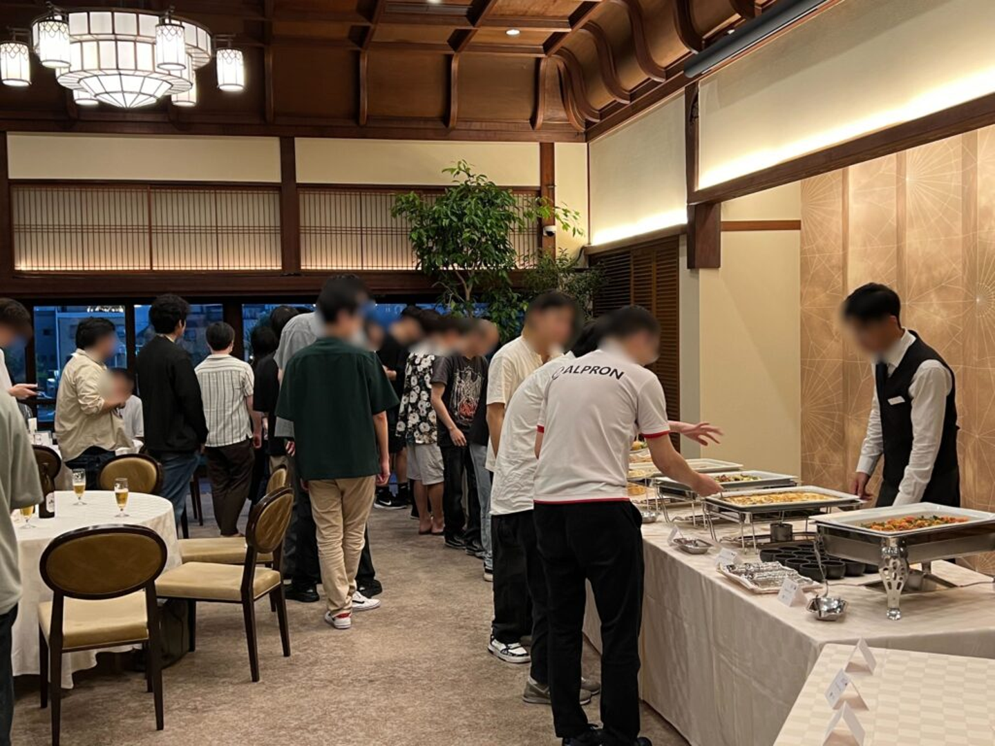挨拶も終わり、お腹を空かせた社員たちはずらりと並べられたビュッフェ形式の料理に我慢できない様子。