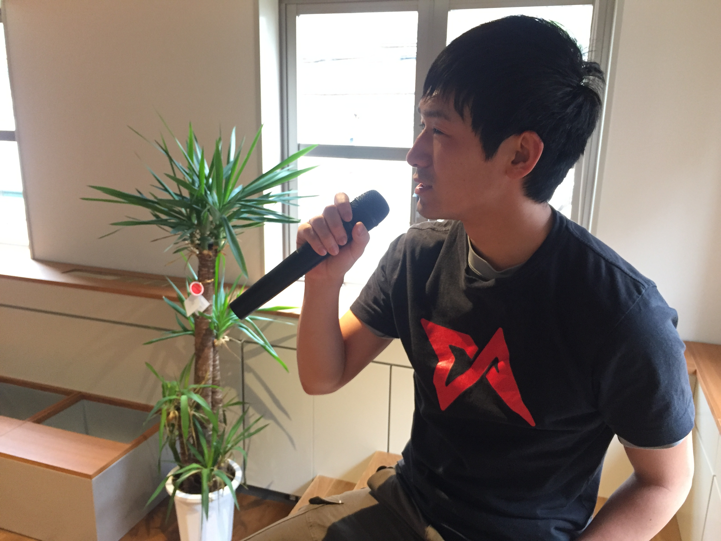 (写真上:インタビューの時にTIA のTシャツを着ていた田中君)