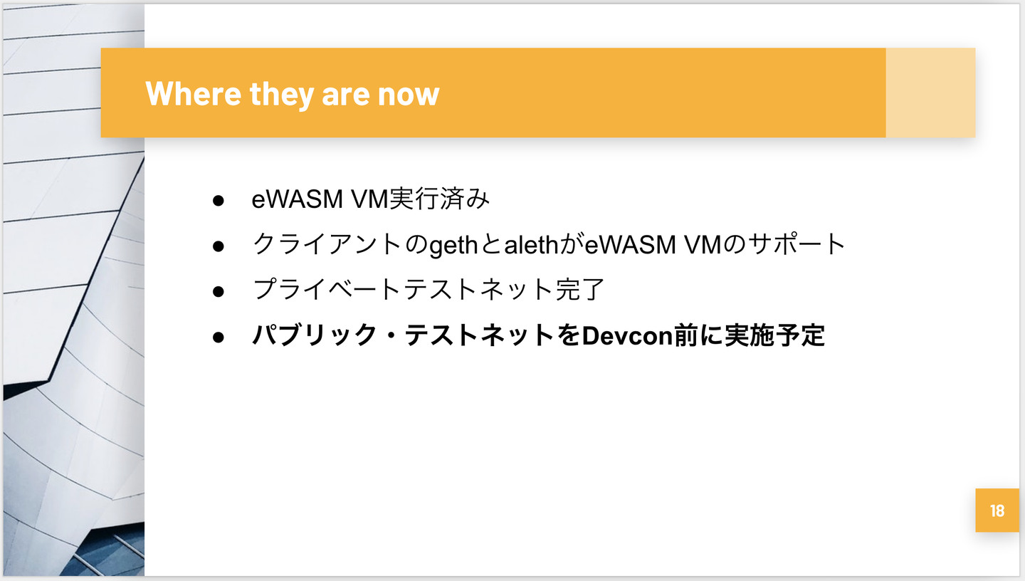 eWASMは現在、既にプライベートなテストネットでの動作確認を完了しており、10/30~11/2にかけて開催されるEthereumデベロッパーの祭典devcon4に合わせてパブリックなテストネットにリリース予定とのことです。