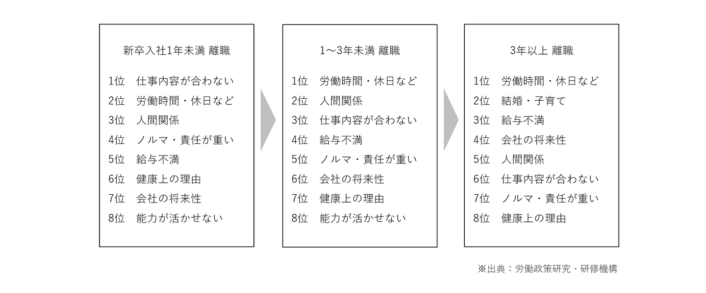 選考や募集記事では書きにくく、実態と合わない表現をしている企業様は要注意です。休日出勤やサービス残業などに対して新入社員は会社に言いにくく、友人や家族に相談し、退職を促されるケースもあります。もしそのような理由で退職が多い現場があれば、業務量や制度の見直しが必要です。