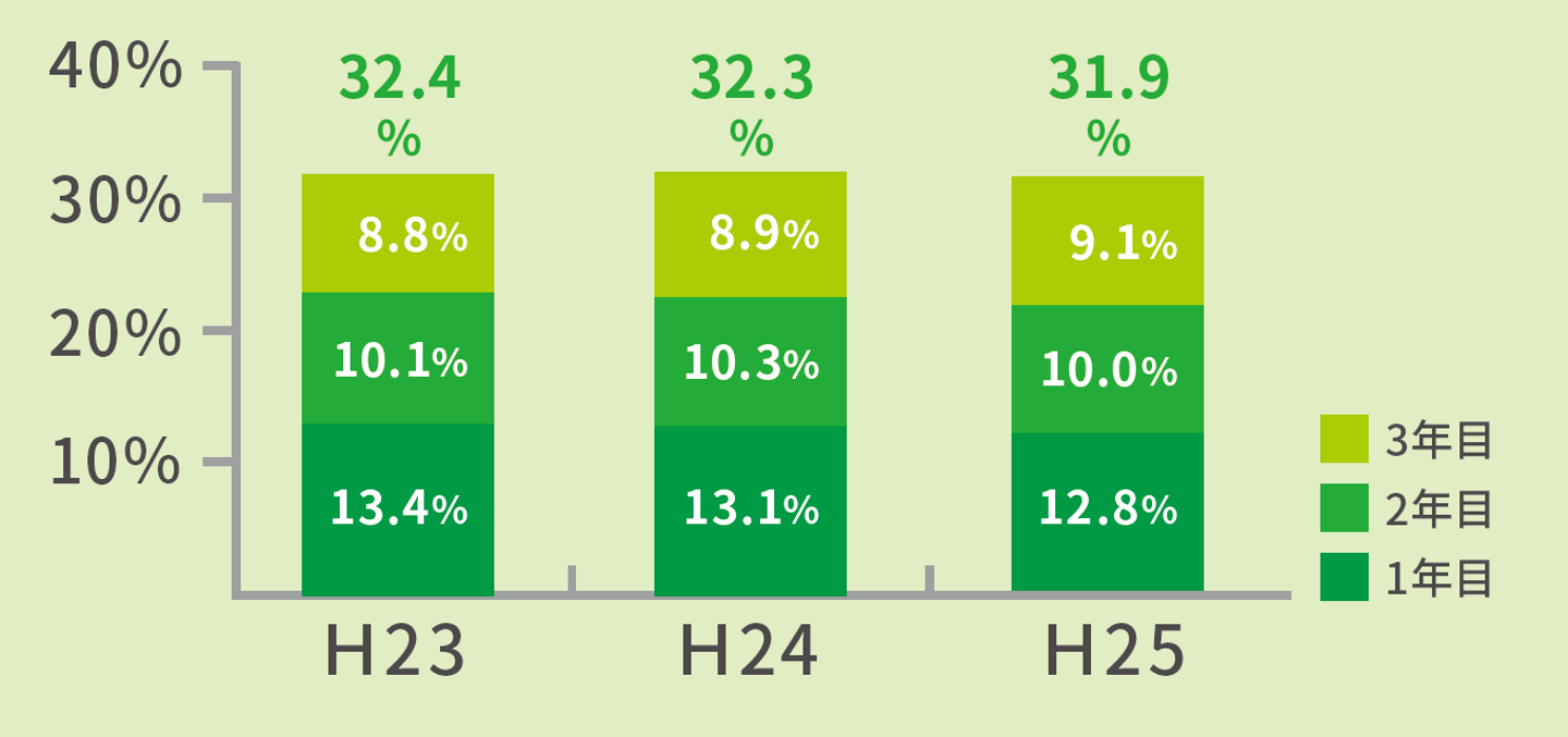 新卒は“3年3割”と言われています。これは、1年目で約1割、2年目で約2割、3年目で約3割の人が離職することを意味しています。