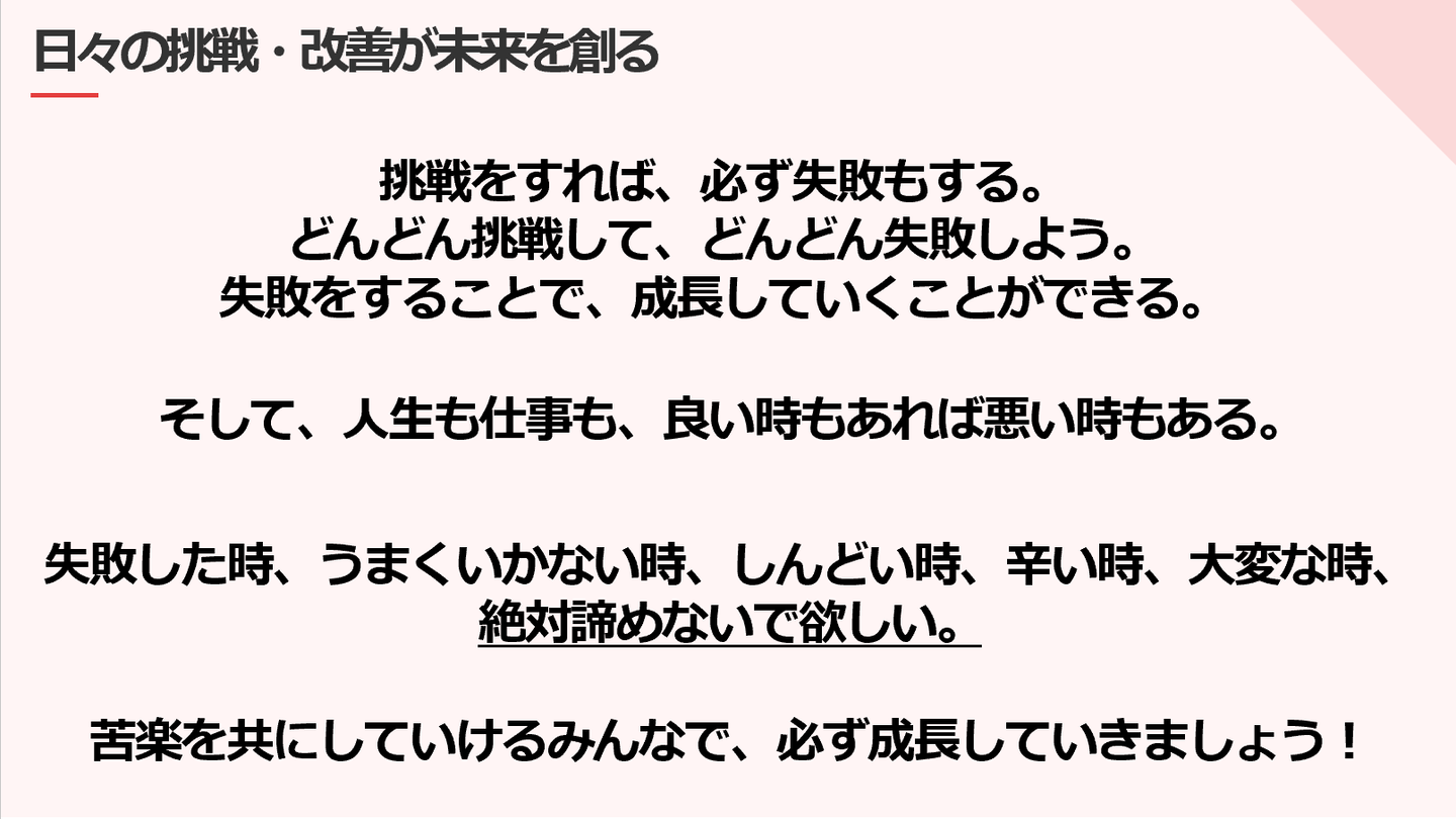 たとえば「昨日30分かかっていた業務を25分で終わらせよう」「より伝わるように資料フォーマットをブラッシュアップしよう」「休みを取りやすいように仕組みやマニュアルを作ろう」といった事も挑戦であり、その積み重ねこそが、私たちの成長に繋がっています。