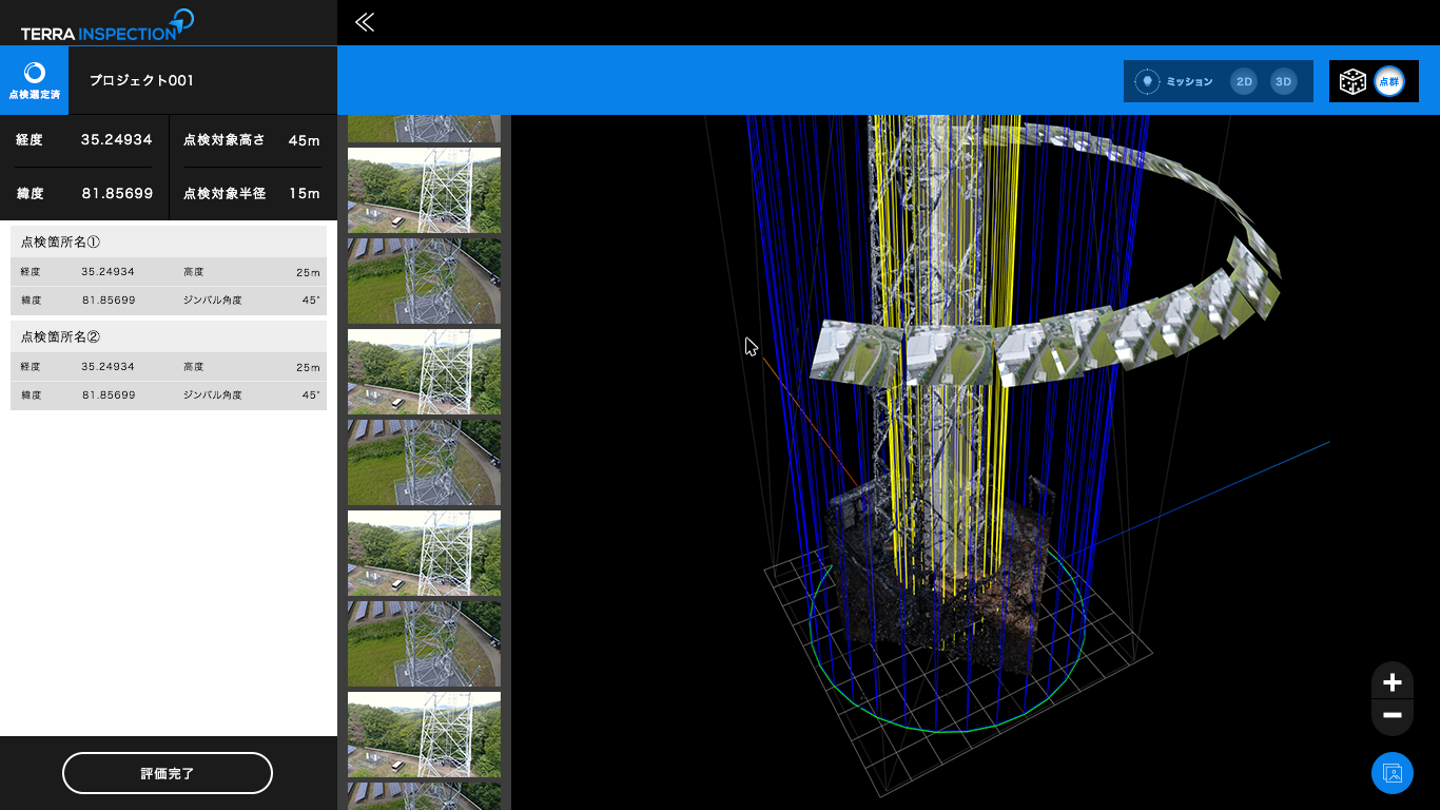 「Terra Inspection」は鉄塔・煙突・橋梁等の建造物の対象点検箇所をドローンで点群生成用撮影と点検箇所をピンポイントで撮影するための自動飛行経路作成・撮影、データ管理、レポート作成を行うソリューションを提供します。