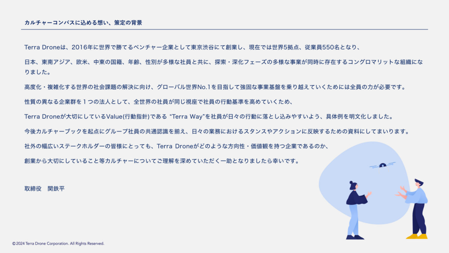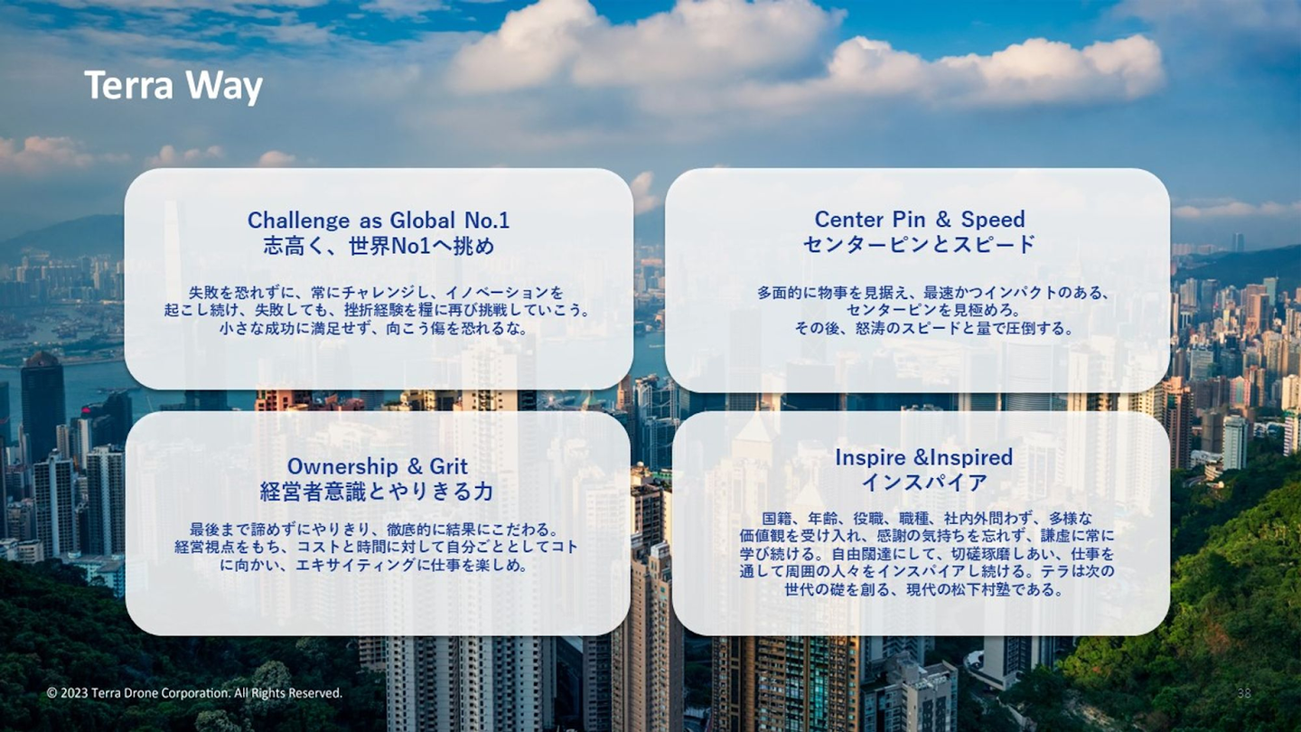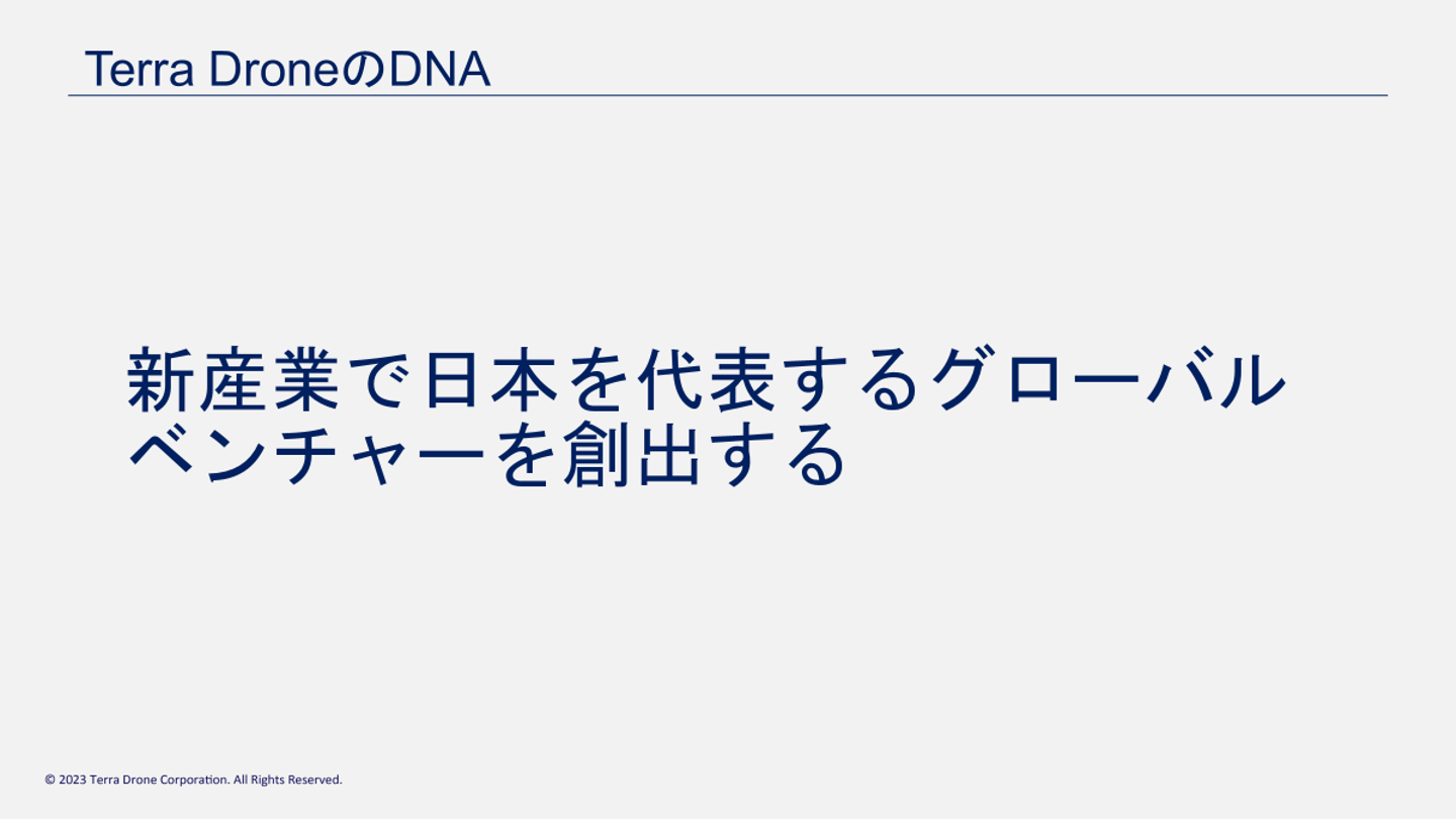 今期はミッションの刷新もあり、テラドローンの新たな章が始まりました。経営陣からは改めて”新産業で日本を代表するグローバルベンチャーを創出する”というテラドローンのDNAについて共有がありました。