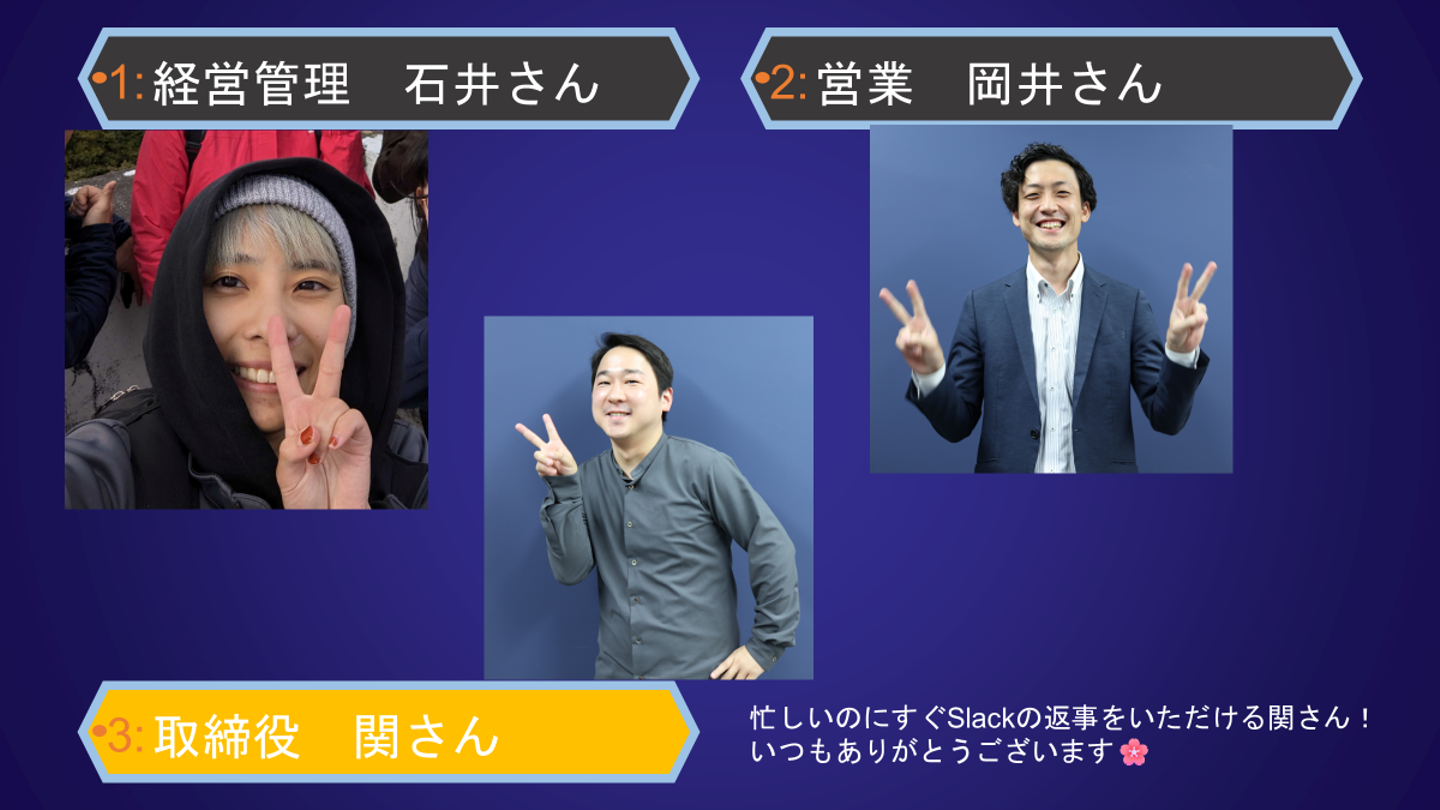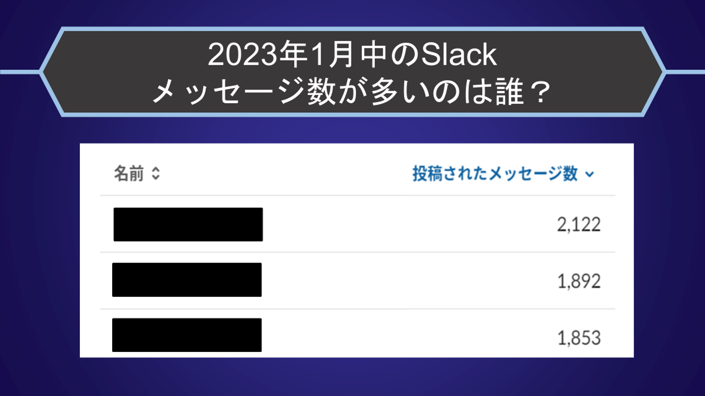 2023年1月のSlackコミュニケーション量が多い人は誰かという問題でした。納得の上位3名って感じです。