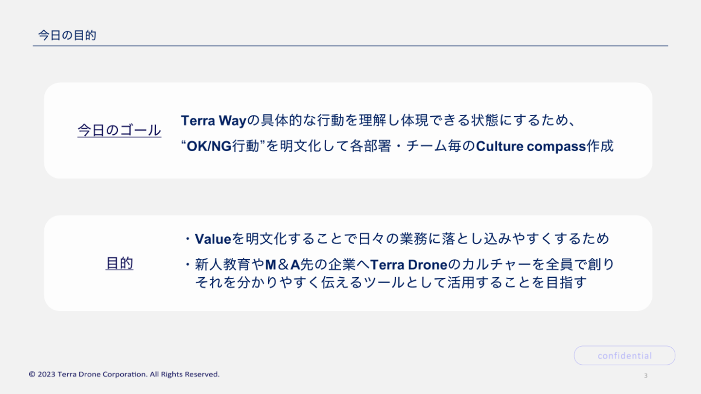 テラドローンのValueであるTerra Wayの具体的な行動を理解してOK/NG行動で明文化して、日々の行動にいかしていくことをを目的としたワークショップを開催しました。